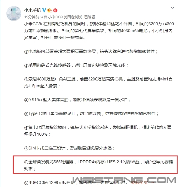 7月9日消息,小米CC9e正式发售,4GB+64GB版售价1299元,6GB+64GB版售价1399元,6GB+128GB版售价1599元。 官方介绍,3200万+4800万前后双旗舰相机、相同的第七代屏幕指纹、相同的4030mAh电池。 以下是官方总结的小米CC9e亮点: 1、索尼4800万超广角AI三摄,前置3200万超高清相机,主摄及前置均支持4in1合成1.6μm超大像素; 2、0.915cc超大实体音腔,响度和低频表现都是一流水准; 3、Type-C接口尾部点胶设计,防尘防腐蚀,更有整体保护套增加密封性; 4、第七代屏幕指纹模组,镜头式光学指纹系统,类似微距相机,相比前代感光面积提升100%; 5、SIM卡托三选二设计,密封胶圈避免意外水侵; 6、全球首发骁龙665处理器,LPDDR4x内存+UFS 2.1闪存堆叠,同价位罕见存储规格。