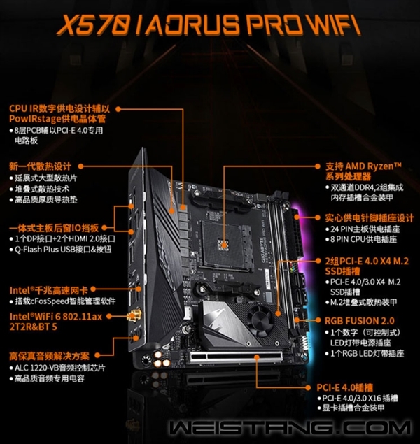 AMD X570平台发布后,六大品牌第一时间奉上了至少35款主板,EATX、ATX、mATX要啥有啥,而做成ITX迷你小板的,只有技嘉的一款X570 Aorus Pro WiFi,在只有17×17厘米的空间内,集成了当今最顶级的配置,除扩展性受限外不属于任何大板。 如今,这款可爱的超强小板已经上架开卖,价格不菲达到了2288元。 技嘉X570 Aorus Pro WiFI配备了八层PCB,无需倍相芯片直出式6+2相供电电路,最大电流70A,服务器级可靠性,24+8针辅助供电,并有新一代散热设计,包括多道剖沟与多层复合式供电散热片、M.2散热装甲、散热背板、芯片组混合动力风扇(智能停转),并有四个温度传感器。 两条内存插槽最高支持DDR4-4400频率、32GB容量(合金装甲),四个SATA 6Gbps和一个M.2 PCIe 4.0 x4存储接口,一条PCIe 4.0 x16扩展插槽(合金装甲固定),Realtek ALC1220-VB 7.1声道声卡(音频专用电容),Intel千兆网卡,802.11ax Wi-Fi 6无线网卡(2T2R/160MHz带宽/2.4Gbps速度)、蓝牙5.0。 灯效当然不能少,RGB Fusion 2.0提供一个可控数字式LED灯带插座、一个RGB LED灯带插座。 背部接口有两个HDMI、一个DisplayPort、四个USB 3.0、一个USB 3.1、一个USB-C、三个音频口,并有一体式集成挡板。 |