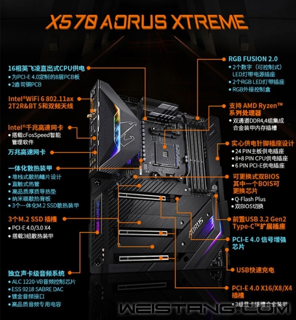 粗略统计,AMD X570主板目前第一批就有至少35款,由于规格和定位缘故都比较贵,最便宜的也要1500元左右,而最贵的……没有最贵,只有更贵。 此前最贵的X570主板是微星的MEG X570 Godlike超神板、Prestige X570 Creation创世板,都要7777元,而一向“高贵”的华硕,即便是ROG Crosshair VIII Formula也只卖到5999元。 现在,微星的记录被打破了,来自技嘉的新旗舰X570 Aorus Xtreme已经上架,售价达到了7888元! 贵自然有贵的资本。这块大雕神板采用了16相英飞凌直出式CPU供电、8+8针CPU辅助供电和6针PCIe辅助供电,针对PCIe 4.0定制八层PCB,包含2盎司铜,并有PCIe 4.0信号增强芯片。 一体化散热装甲,包括堆栈式鳍片、直触式热管、高品质厚质导热垫、纳米碳散热背板、一体化M.2散热装甲、智能启停风扇。 |