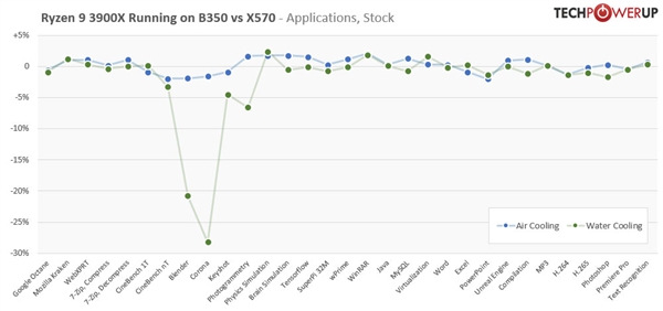 AMD锐龙处理器的兼容性一直备受称道,至少到明年都会坚持AM4接口,这就使得老主板可以轻松上新U。这不,三代锐龙刚发布,各家的300、400系列主板就升级BIOS做好了准备,部分厂商甚至解锁了PCIe 4.0(尽管AMD表态不允许)。 最新的X570主板虽然很好很强大,但价格也有点贵,目前最便宜的也得1299元,而新的主流款B550据说要到明年初才发布,所以无论X470、B450还是X370、B350,DAU短期内仍然要发挥余热。 那么,老主板搭配新锐龙,性能上会有什么损失吗? TechPowerUp特意做了一次测试,找了一块华硕PRIME B350M-Plus,目前国内售价仅899元左右(也是很多板U套装的最爱),刷上新BIOS就点亮了12核心24线程的锐龙9 3900X。 先来看看超频,水冷时1.2V电压可以超到全核4.0GHz,再加25MHz也会崩溃,这和X570上是一样的。 测试项目一共多达31个,汇总如下。其中蓝色线为猫头鹰NH-U12S风冷结果,绿色线为Asetek 240mm一体式水冷结果。 可以看到,使用风冷的时候,B350、X570主板的性能差异都不超过2%,完全属于误差范围之内,而使用水冷的时候,大部分情况下也差不多,但也有几个例外:Corona落后了接近30%,Blender落后了超过20%,Keyshot、Photogrammetry则落后了5%左右。这几个项目都对多线程很敏感,尤其前两个负载非常高。 不是说书冷比风冷更好吗?怎么还落后了这么多呢? 答案就藏着VRM供电电路及其温度上。 超频到全核4.0GHz后温度冲到了138℃,偶尔还会更高,而一旦达到140℃,频率就会自动降到550MHz。 很显然,在这样的板子上,水冷只能照顾CPU处理器本身,而周边的VRM电路就没人管了,风冷则可以顺带给VRM电路降温最多超过30℃,从而保证处理器在超高负载时不至于降频。 结论很简单:即便是第一代的B350主流板子,也依然可以带动12核心的锐龙9 3900X,性能、超频都和X570上没什么两样,唯一要注意的就是得选一个好点的风冷散热器,顺带给主板供电区域降温。 |