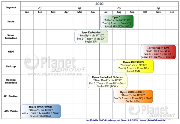 Planet3DNow上关于AMD新处理器代号和路线图的文章引发广泛关注,提供了很多此前不曾为人了解的信息。 其中,ThreadRipper产品线第三代产品代号Castle Peak,第四代产品代号Genesis,这是位于华盛顿的两处地理坐标。 看完HEDT,再来了解下锐龙家族。 按照时间顺序,明年一季度,AMD会推出Ryzen 4000U/4000H系列移动APU,其中U代表低电压,H代表35W标准电压,处理器家族代号Renoir(雷诺阿),升级到Zen 2架构,即7nm CPU+12nm I/O集成化设计,同时搭配Navi显卡,插槽为FP6,BGA封装。 接着在二季度末,EPYC嵌入式芯片“Starship”上线,最高8C16T,Zen 2架构。6月份是Ryzen嵌入式G系列芯片,代号River Hawk,Zen 2架构,最高4核8线程。 第三季度的产品最富竞争力,毕竟Zen 3架构将新鲜登场,首秀是代号Milan的第三代EPYC,最高64核128线程。8月份将是锐龙4000桌面处理器和锐龙APU产品,前者当然升级到Zen 3,代号Vermeer(维米尔),最高16核,延续AM4接口;后者则升级为Zen 2架构,采用Ryzen 4000G/GE的命名,Zen 2架构+Navi。 同年第四季度是线程撕裂者4000产品,最高64核128线程。这一路线图也呼应了本周一则消息,AMD最快10月份推出第三代线程撕裂者,最高48核? |