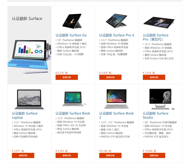 喜欢Surface而又预算不足的童鞋们,抄底的机会来了! 7月22日,微软中国官方商城上线了官方翻新Surface折扣活动,限时特惠6折起。 其中,Surface Go官翻2376元起,Surface Pro 4官翻2429元起,Surface Pro第五代官翻3216元起,Surface Laptop官翻3971元起,Surface Book官翻4329元起,Surface Book 2官翻6186元起,Surface Studio官翻15644元起。 值得一提的是,此次优惠活动时间仅有5天,7月26日恢复原价。 据了解,微软官方翻新Surface都经过校调并重新安装 Windows 操作系统和软件更新,满足官方质量标准,翻新流程包括硬件损坏修复和外观品质检查,数据擦除,软件升级和诊断测试。 此外,微软为官翻Surface提供两年有限硬件质保。 感兴趣的可移步微软官方商城查看价格详情。 |