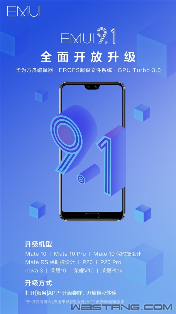 华为EMUI官方宣布,EMUI 9.1正式版现已全面开放升级,支持P20系列、Mate 10系列等十款机型。 一周前,EMUI 9.1面向Mate 20系列首先开放正式,支持Mate 20、Mate 20 Pro、Mate 20保时捷设计、Mate 20 X,不但有方舟编译器、EROFS超级文件系统、GPU Turbo 3.0,还有针对性的联通VoLTE、30倍变焦、全面屏手势优化。 本次开放升级支持Mate 10、Mate 10 Pro、Mate 10保时捷设计、Mate RS保时捷设计、P20、P20 Pro、nova 3、荣耀10、荣耀V10、荣耀Play,都是麒麟970机型。 升级方式为打开手机自带的服务APP,然后点击升级尝鲜,申请即可在系统更新中进行升级。本次升级不会删除个人数据。 EMUI 9.1新版亮点: - 新增支持华为方舟编译器,提升系统响应性能和流畅度。 - 新增超级文件系统(EROFS)性能革新技术,提升应用运行速度和流畅度。 - 智能视频:智能提取精华片段、自动匹配特效模板,一键制作更精彩的MV。 - 来电视频:可设置个性视频为来电视频秀,趣味十足。 - 语音助手:可通过语音唤醒自拍、慢动作录像、识别卡路里、百科识物、扫码、搜图等更多功能。 - GPU Turbo 3.0:图形处理加速新增支持几十款游戏。 - Huawei Share一碰传:手机与MateBook建立连接后,可实现设备间剪贴、录屏分享等动作的续接。 - 设置精简:精简部分冗余、繁杂设置项,界面更简洁、易懂、易操作。支付保护中心APP移至设置的安全和隐私-支付保护中心。黄页数据、号码归属地、名片模板自动更新设置合并为数据自动更新设置。 |