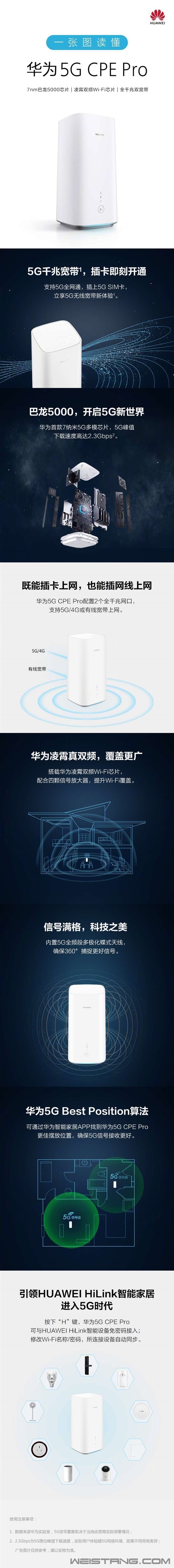 7月29日消息,华为终端官方微博宣布,华为5G智能路由器5G CPE Pro正式发售,售价是2499元(首销限时直降50元,到手价2449元)。 华为5G CPE Pro是国内首款支持5G全网通的智能路由器,它搭载华为首款自研7nm多模5G芯片—巴龙5000,5G峰值下载速率最高可达2.3Gbps,3秒即可缓存一部超清电影,插上5G SIM卡,即可享受5G无线宽带体验。 而且华为5G CPE Pro内置全频段,高达4.9dBi高增益,仿生蝶式双极化巴伦天线,确保360°捕捉最好信号,速度更快、家中摆放更随意,信号质量整体可增强2.8倍。 此外,华为5G CPE Pro支持4G、5G、有线宽带混合组网,稳定不掉线。可使用5G网络和有线宽带,实现两路双宽带加速,突破网站服务器带宽限速,针对视频及云文件实现2倍下载速度,还支持4K视频倍速播放不卡顿。 |