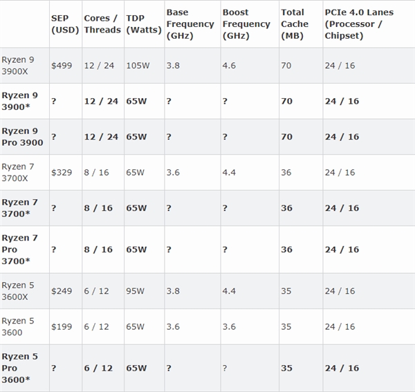 最新报告显示Intel在桌面处理器市场上的份额已经降至81%,在这个领域AMD近两年来的增长非常快,势头也非常猛,特别是7nm工艺的锐龙3000系列处理器,竞争力更强大了。 在桌面平台,AMD今年除了6核、8核处理器之外还推出了12核、16核的锐龙9游戏处理器,不过锐龙9 3950X还没开卖,目前的旗舰还是锐龙9 3900X处理器。 锐龙9 3900X处理器是12核心24线程,主频3.8-4.6GHz,缓存70MB,热设计功耗105W,价格3999元,相比于酷睿i9-9900K便宜100元,但是多核性能完胜。 按照AMD的规划,除了桌面级市场之外,7nm锐龙3000系列还会针对OEM市场推出锐龙Pro系列,它们的规格跟桌面级处理器基本一致,但部分特性会比不同,不像桌面处理器那样追求极限性能。 在欧亚经济体ECE网站上,有网友发现了AMD申请认证的锐龙Pro系列处理器,其中有锐龙9 Pro 3900、锐龙7 Pro 3700、锐龙5 Pro 3600及锐龙5 Pro 3500四款商业级处理器,其他还有锐龙9 3900及锐龙7 3700两款非X后缀处理器。 目前还没有这几款处理器的具体规格,但TDP功耗统一为65W,考虑到OEM市场不会超频,那么更低的TDP功耗很好理解。 其中锐龙9 3900是12核24线程的,TDP只有65W的话,对不喜欢超频的玩家来说简直是神器啊。 当然,相比台式机版锐龙9 3900X的105W TDP功耗,65W意味着减少了40W,那频率显然也会有所降低,就看AMD降低到多少了。 除了锐龙9 Pro 3900之外,锐龙5 Pro 3500也颇为值得关注,这应该是一款低功耗低价的的6核处理器,桌面版目前还没有锐龙5 3500处理器的身影,它很可能是OEM专属的产品。 |