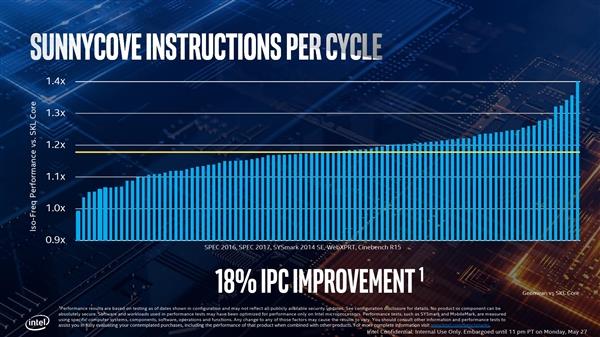 目前Intel已经有2座晶圆厂生产10nm处理器,2021年则会推出7nm工艺,号称媲美友商的5nm工艺。 十代酷睿代号Ice Lake,除了升级到10nm工艺之外,还用上了全新的SunnyCove核心架构以及Gen11核显,可以说从CPU到GPU,从内存到多媒体,从显示输出到图像处理,从互连总线到雷电3,都是新的。 至于性能,根据Intel之前公布的数据,SunnyCove架构相比之前的Skylake架构,IPC性能最多提升40%,平均也提升了18%。