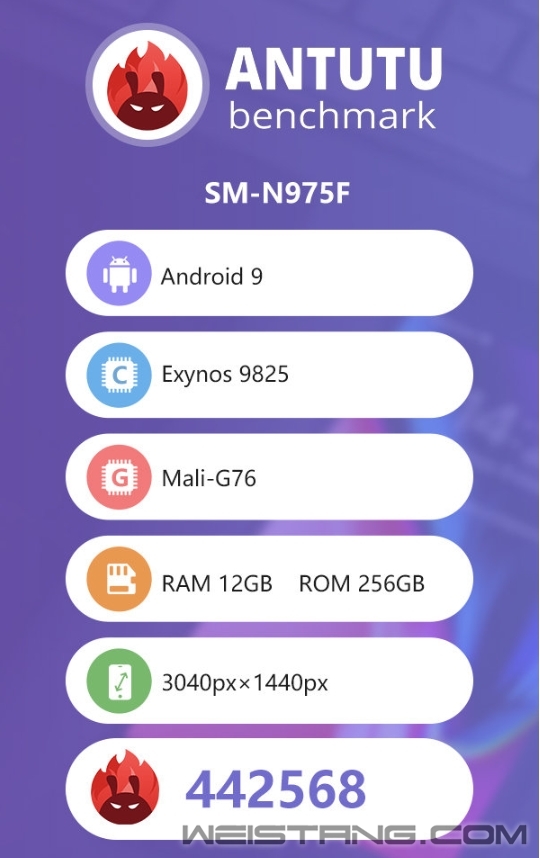 8月9日,安兔兔官微表示在后台发现了三星刚刚发布的全新Exynos处理器——Exynos 9825,并公布了这款旗舰处理器的安兔兔跑分。 安兔兔在后台发现的是型号为SM-N975F的版本,推测应该是LTE国际版的Note 10+,其配备的是12GB内存以及256GB机身存储空间。 跑分方面,目前安兔兔统计到的总成绩为442568,已经超过了绝大部分的骁龙855机型,但相比骁龙855 Plus机型来说还是有比较明显的差距。 据官方介绍,Exynos 9825是业界首款采用7nm EUV工艺的移动处理器,其功耗、性能首屈一指。它集成了神经处理单元(NPU),专为从人工智能到增强现实的下一代移动体验而设计。 Exynos 9825由两颗定制CPU、两颗Cortex A75核心和四颗Cortex A55核心组成,配备Mali-G76 MP12 GPU,运行速度更快,支持UFS 3.0闪存和LPDDR4X内存,由三星Galaxy Note 10系列首发。 |