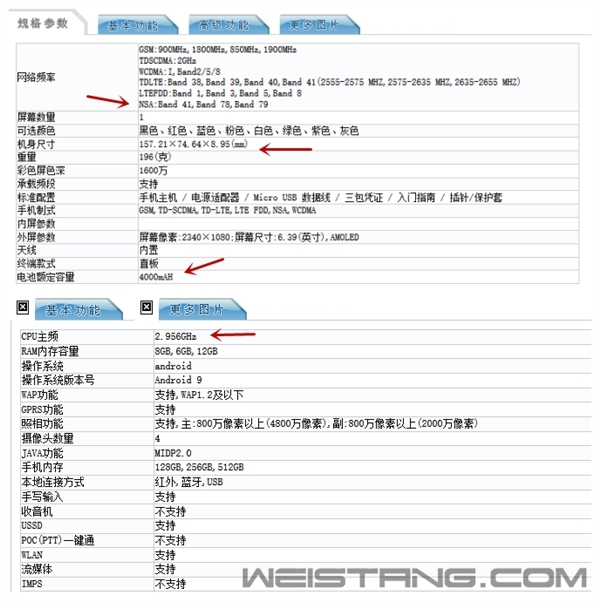按照联通官微的说法,小米第二款5G手机名为小米9S,定于9月发售。 日前获得3C认证以及出现在工信部入网机库中的M1908F1XE看起来很像是小米9S的真身所在。 图为小米9 继基本参数和“证件照”后,该机的更多规格信息公布出来,部分印证了此前猜测,但也出现了不一致的地方。 具体来说,“小米9S”拥有一块6.39英寸2340×1080分辨率水滴屏,并非所谓2K,RAM 6G/8G/12GB,ROM128/256/512GB,电池4000mAh。 SoC主频2.956GHz,大概率是骁龙855 Plus。 另外,整机三围157.21×74.64×8.95mm,重196g,支持5G NSA频段,后竖排三摄。 看来,作为小米9的5G网络升级版,“小米9S”在处理器、电池方面均更加给力,只是还不确认主摄的OIS光学防抖是否会一并加入。 |