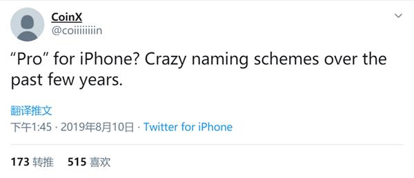 iPhone 11 Pro、iPhone 11、iPhone 11R ? 在距离秋季发布会越来越近的时间点,关于新 iPhone 的传闻也多了起来,如今被曝光的是“命名”。一位来自推特的匿名用户在前两天发布了一条信息,暗示新 iPhone 或将使用“Pro”的后缀命名。 在这条推文中,CoinX 写道:“iPhone 采用 Pro 后缀?放在几年前这可能是疯狂的想法。”值得一提的是,去年的 iPhone XS 系列和 iPhone XR,他均准确爆料了命名、手机重量、内置壁纸等信息,而且在随后的 iPad Pro 和新 iPad mini 中也均有几次准确爆料。 然而在前几天的这条推文中,他没有爆料新 iPhone 的完整命名,但结合“Pro”的后缀,我们也可以来猜一猜新 iPhone 将采用何种命名。结合各方爆料,今年的新 iPhone 大概率和去年一样采用三机型的路线,包括两款采用 5.8 英寸和 6.5 英寸 OLED 屏幕的高端版本,以及一款采用 6.1 英寸 LCD 屏幕的中端版本。 如果按照“数字+Pro”的命名方式,那么 6.5 英寸 OLED 版本或许会被命名为 iPhone 11 Pro、5.8 英寸 OLED 版本则命名为 iPhone 11、6.1 英寸 LCD 屏幕版本命名为 iPhone 11R。其中 iPhone 11 Pro、iPhone 11 可能采用后置三摄的方案,支持反向无线充电、更大的电池等独占配置,而 iPhone 11R 可能采用后置双摄、多彩配色的配置。 |