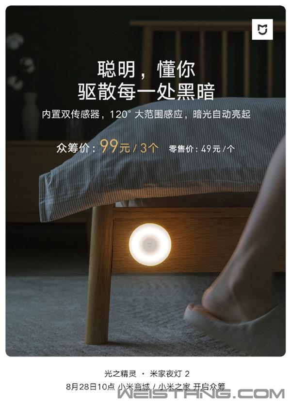 夜晚起床上厕所,不开灯摸黑多有不便,而开灯又影响家人,这时如果有感应夜灯就很方便了,亮度足以看清路面,但又不会影响睡眠,可以说是价格不贵又能极大提升生活幸福感的小物件。 米家官微宣布,米家夜灯2将于8月28日早10点开启众筹,众筹价99元/3个,零售价49元/个。 根据预热海报显示,米家夜灯2采用磁吸结构设计,可随取随放,适用于更多场景。同时内置双传感器,120°大范围感应,暗光自动亮起。 此处双传感器应该为人体传感器和光线传感器。 米家官微宣布:“我叫光,是一个聪明,善解人意的“光之精灵”。我关心你的起居,在意你在家里的动向,清楚的知道应该何时为你亮灯、熄灯。” 第一代米家感应夜灯于2017年7月发布,售价49元,第二代米家夜灯价格保持不变,众筹价合33元/个,感兴趣的不要错过。 |