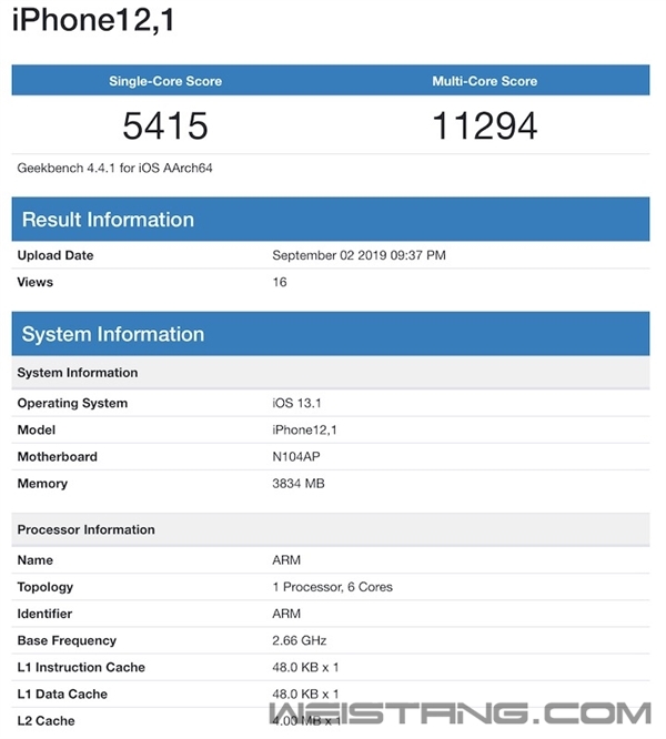 在新一代iPhone发布前夕,疑似A13处理器跑分现身GeekBench 4.4数据库。 名为iPhone 12,1的设备可能是所谓的iPhone 11,也就是iPhone XR的迭代型号。 从跑分来看,这是一款6核ARM架构处理器,基础频率2.66GHz,此次单核5415分,多核11294分。 此外,“iPhone 11”运行在一套4GB RAM、搭载iOS 13.1系统的平台上。 回到性能方面,基础频率相较于A12的2.49GHz增加了6.8%,单核成绩比A12典型平均值4796分提升了12%,多核则基本持平。 还有细心人士注意到主板识别码N104AP,一级缓存和二级缓存容量相较于A12 Bionic有所减少,这可能是GB4对未做专门优化的新平台判断不准造成的,毕竟大小核难以区分。 此前爆料称,A13处理器标配在三款新iPhone上,且内部新增矩阵协处理单元用于复杂运算,iPhone 11 Pro型号的运行内存会增加到6GB。 |