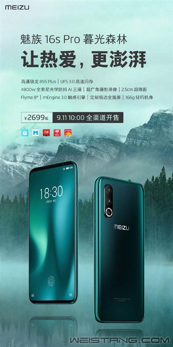 8月28日下午,魅族16s Pro正式发布,6+128GB 2699元;8+128GB 2999元;8+256GB 3299元。 魅族16s Pro提供暮光森林、梦幻独角兽、黑之谧镜、白色物语四色可选。其中暮光森林将于明天10:00在魅族商城、魅族天猫、京东、苏宁易购官方旗舰店正式开售。 暮光森林版取“暮色笼罩森林”之意,官方表示这种色彩比翡翠多一分灵动、比墨绿多几分典雅,以暮色森林为名,再现万物生机。 魅族16s Pro采用经典极边全面屏设计,保持对称美感的同时,薄至7.65mm,重166g。 屏幕方面,魅族16s Pro采用三星定制的6.2英寸Super Amoled屏幕,高达103%的 NTSC色域、96.1%的DCI-P3色域,并有DC调光加持,触摸采样率从上一代100Hz提升为160HZ。 相比16s,16s Pro的屏下指纹识别速度再次提升25%,0.15秒疾速解锁,媲美实体指纹按键。 魅族16s Pro搭载高通骁龙855 Plus处理器,主频高达2.96 GHz,自带Adreno 640在骁龙855基础上性能再增强15%,全系列配备UFS 3.0存储,采用第二代双超线性扬声器与mEngine 3.0触感引擎,支持OneMind 3.5智能调优,号称让16s Pro的综合性能提升了40%。 摄像方面,魅族16s Pro前置三星3T2 2000W像素摄像头,后置全索尼AI三摄:索尼4800W IMX586+索尼2000W IMX350+索尼 1600W IMX481组合,支持117° 超广角、2.5cm超微距、3倍无损变焦、8倍数码变焦,4K 60帧超清录像/480帧慢动作录像/超广角录像。 |