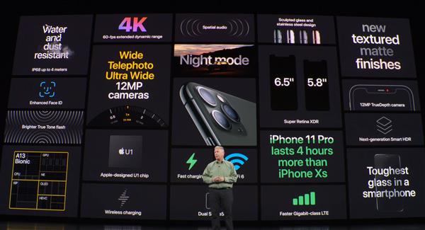 在秋季发布会上,苹果正式推出了新一代iPhone 11 Pro及iPhone Pro Max手机,分别配备了5.8寸、6.5寸OELD屏幕,升级了三摄拍照,售价999、1099美元起,跟去年的价格一样。 外观方面,iPhone 11 Pro配备了5.8寸OLED屏幕,iPhone Pro Max则是6.5寸OLED屏幕,两者都保留了Face ID设计,所以还是刘海屏,OLED屏幕亮度可达1200nit,苹果称之为Super XDR。 处理器升级到最新的A13,采用7nm工艺制造,85亿个晶体管,集成六个CPU核心,其中两个大核心性能提升20%、功耗降低30%,四个小核心性能提升20%,功耗降低40%。 同时集成四核心GPU,性能提升20%,功耗降低40%,Metal优化,还有八核心神经引擎(类似NPU),性能提升20%,功耗降低15%。 电池及续航方面,苹果照例没公布电池容量,但是iPhone 11 Pro的续航时间比iPhone XS高出4个小时,同时标配18W快充,放弃了祖传5V/1A充电头了。 变化最大的就是拍照了,升级到了后置三摄,主摄是1200万像素广角镜头,支持OIS光学防抖,长焦也是1200万像素,同样支持OIS光学防抖,超广角像素还是1200万的,支持13mm焦距,120°超广角。 除了拍照硬件上的变化,苹果还在拍照及录像软件上下了功夫,图形处理、视频编辑功能更强大。 另外,苹果这次也加入了Night Mode,也就是夜景拍照模式。 至于大家很关心的网络问题,5G肯定是没有,但苹果提到了更快的千兆LTE、WiFi 6,不知道信号能不能有改善。 最后就是售价及上市时间了,iPhone 11 Pro售价999美元起,iPhone Pro Max是1099美元,跟去年一样,国行是8699元、9599元起,今天开始接受预订,9月20日上市。 |