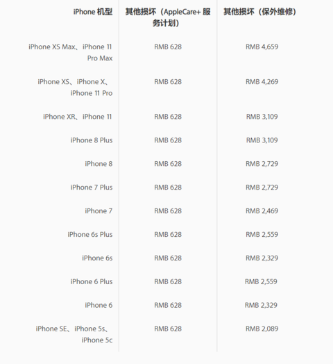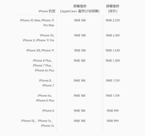 今日苹果中国正式公布了iPhone 11全系列的维修费用,其中屏幕维修费用最贵高达2559元(iPhone 11 Pro Max)。消息公布后,网友:买得起,修不起! 具体来说,屏幕维修(保外)费用: iPhone 11,1549元 iPhone 11 Pro,2169元 iPhone 11 Pro Max,2559元 其他损坏(保外维修)的费用分别为3109元、4269元和4659元。 对于苹果来说,他们还是鼓励用户去购买Apple Care+,这样有了这个保修服务的话,手机保修期内维修屏幕的费用只要188元(维修其他零部件是628元),但是你需要为iPhone 11额外花1300多元来购买这个服务(iPhone 11 Pro系列保修服务是1700多元)。 其他零部件损坏维修费更吓人 |