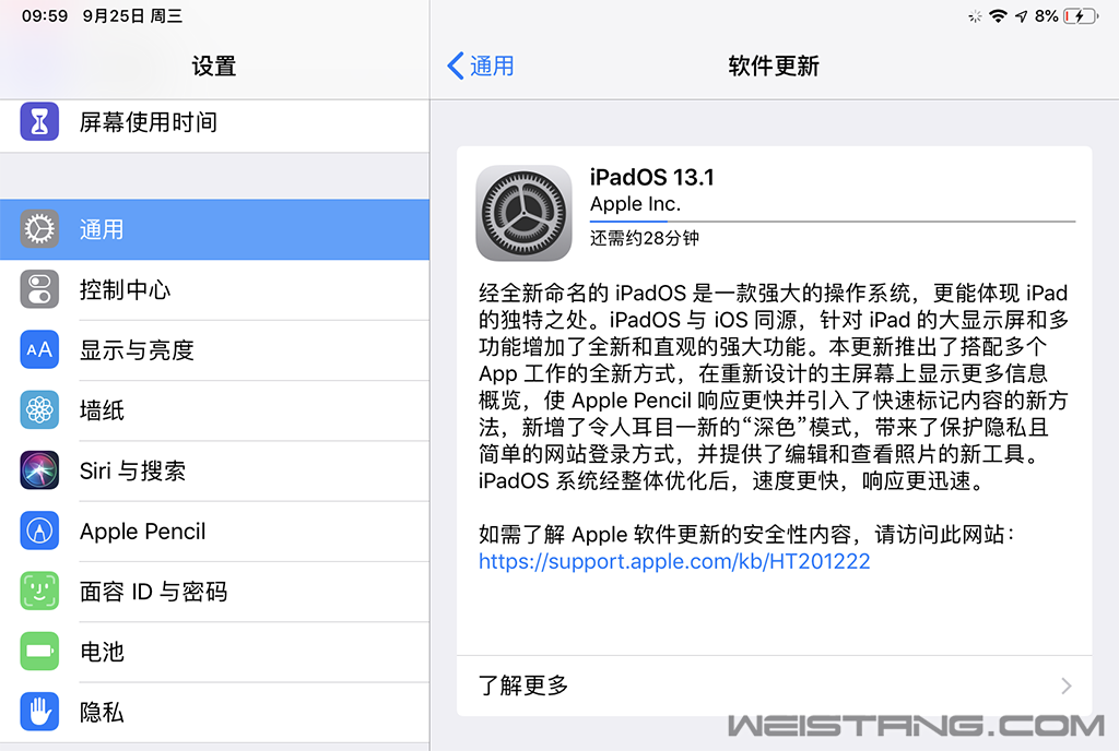 上次iOS 13正式版推送时,苹果“遗漏”了iPadOS,现在他们终于补上了这环。 今天,苹果正式推送了iPadOS 13.1,作为一款针对iPad的系统,其是在iOS的基础上演变来说,换句话说,iPadOS 13.1中的不少功能跟iOS 13.1是相同的,但是前者还特别对iPad进行了特别的优化。 具体来说,iPadOS 13.1的主屏幕经过重新设计,新的布局在每一页上可显示更多app。用户现在可将“今天”视图添加到主屏幕,以快速查看小组件来一览各种信息,包括天气、日历、日程活动、使用技巧等。 升级至最新的系统后,iPad用户还可利用更新的“分屏浏览”功能,在同一个app中同时处理多个文件和文稿,或者使用“侧拉”功能,快速在多个 app 之间进行查看和切换。 另外,升级最新的系统后,iPad用户还能从屏幕角落划动 Apple Pencil 调出工具,就能在iPad上标记和发送整个网页、文稿或电子邮件。 |