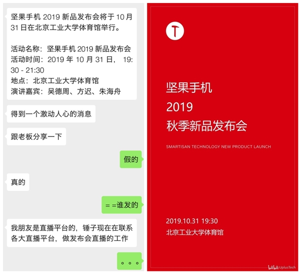 9月27日消息,有锤友群曝光了锤子科技新机的发布时间,消息称锤子科技将于10月31日举行新品发布会,地点是北京工业大学体育馆,演讲嘉宾是吴德周、方迟和朱海舟。 B站UP主UplusTech据此还做了锤子科技新品发布会海报(如下图所示)。 当前有关新机发布时间的真实性有待证实,不过可以确定锤子科技今年推出新品,考虑到2019年还剩三个月时间,不排除10月份亮相的可能。 遗憾的是,关于锤子科技新机的细节暂时不得而知,猜测它可能继续以坚果手机命名。 目前锤子科技有R、Pro、数字系列三大产品线,覆盖高端、中端、入门。如果锤子科技推出新机,你会考虑购买吗? |