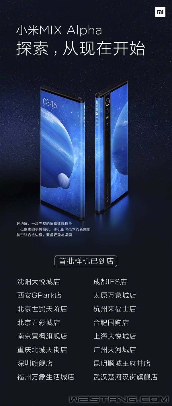 今晨(9月28日),雷军在微博“广而告之”,小米MIX Alpha展示及已经到店小米之家,欢迎大家前往体验。 据悉,首批样机已经覆盖沈阳大悦城店、成都IFS店、西安GPark店、太原万象城店、北京世贸天阶店、杭州来福士店、北京五彩城店、合肥国购店、南京景枫旗舰店、上海大悦城店、重庆北城天街店、广州天河城店、深圳旗舰店、昆明顺城王府井店、福州万象生活城店、武汉楚河汉街旗舰店等。 小米MIX Alpha拥有一块7.92英寸OLED环绕屏(2088x2250),骁龙855 Plus,12+512GB UFS 3.0存储,三星一亿像素主摄、4050mAh电池、厚度10.4mm,重量241g。 目前,小米MIX Alpha正尝试小规模量产,预计12月上市,首批零售价19999元。 |