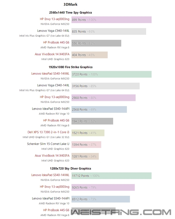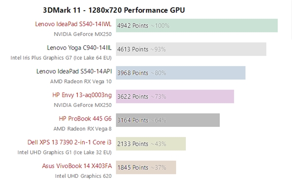 Intel 10nm Ice Lake十代酷睿处理器整合了第11代核芯显卡(同样隶属于十代酷睿的Comet Lake还是9.5代核显),架构重新设计,支持大量全新技术,同时最多提供64个执行单元,性能有了新的飞跃,也是Intel核显浮点性能首次突破1TFlops,理论上已经可以和AMD APU一战。 近日,NoteBookCheck拿到了一部联想Yoga C940,其采用了一颗十代酷睿旗舰处理器酷睿i7-1065G7,集成了最高级别的G7核显,64个单元,加速频率1.1GHz,同时搭配16GB LPDDR4X-1733双通道内存。 10nm Ice Lake内核照:大的是处理器,小的是芯片组 一起来看它到底如何! 参与对比的笔记本与显卡(均为双通道内存): - 戴尔XPS 13 7390:Ice Lake G4(32单元) - 联想IdeaPads S540 14:MX250 25W、AMD RX Vega 10 - Schenker Slim 15:Comet Lake UHD 620(24单元) - 华硕VivoBook 14 X403F:Whiskey Lake UHD 620 - 惠普Envy 13:MX250 10W Ice Lake G7 64EU核显相比于AMD Vega 10领先了16-23%,相比于次级别的Vega 8则领先了多达45-64%,对比上代UHD 620更是数倍的提升,实际上已经领先其他任何集成GPU,仅次于MX250 25W独立显卡。 |