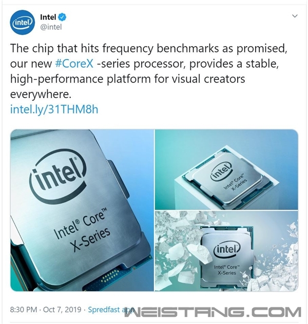 昨晚(10月7日),Intel发布新一代酷睿X桌面发烧级处理器,覆盖10~18核,采用14nm Cascade Lake-X架构,定价590~978美元。 虽然从理论上讲仍是Skylake家族,但添加DLBoost、AVX-512等指令集和睿频Max 3.0后,最高加速频率达到了4.8GHz,比上代又提升300MHz。 没想到,官方推特将Boost频率作为一个卖点来宣传,即“新Core X可以达到承诺频率”。 无疑,这是在揶揄竞争对手AMD,三代锐龙此前遭遇了官标Boost频率大概率达不到的尴尬问题,好在通过微码BIOS更新已经得以修复,11月还有一轮有着多达100多处改进的微码交付。 |