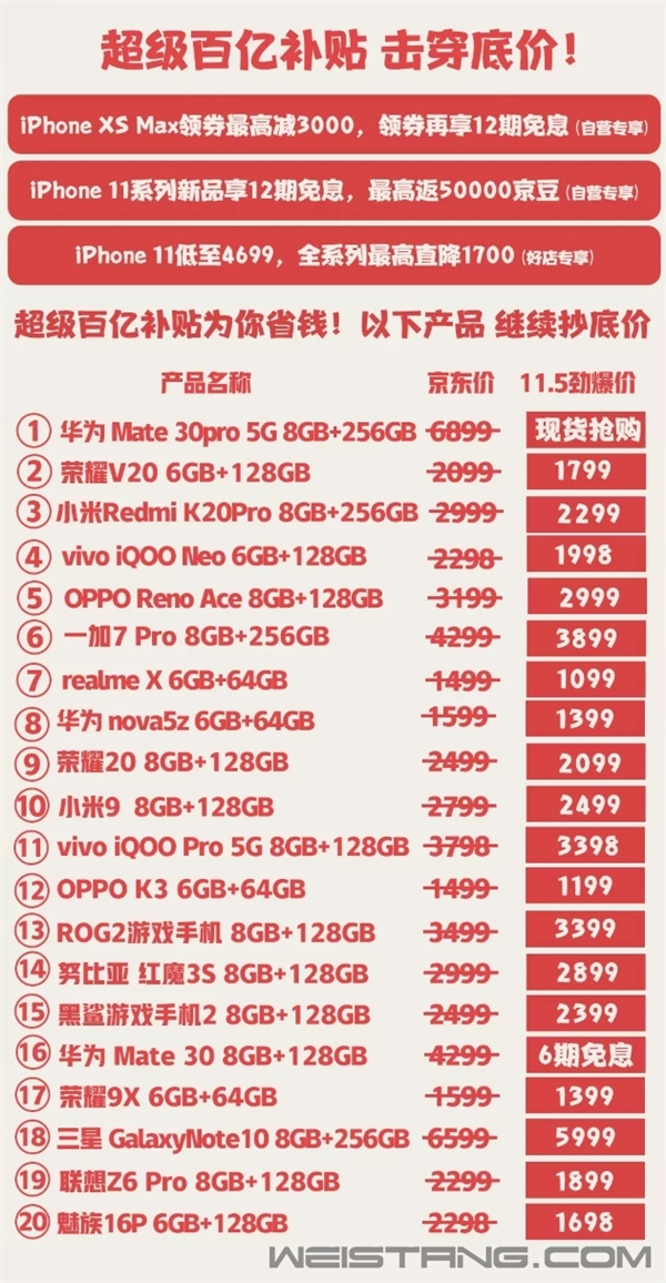 5G潮流轰轰烈烈,早就想入手一个5G新机尝尝鲜,老手机用了很久一直想换,却怎么也等不到新品降价。日前,京东官方公布了一份双11手机狂欢日爆款清单,近期打算换新机的童鞋可以照着这份清单下手了。 从这份清单来看,此次双11为手机品类提供了百亿补贴,多款产品击穿底价。 其中,iPhone XS Max领券最高减3000元,同时领券再享12期免息。iPhone 11系列新品享12期免息,最高返50000京豆。iPhone 11低至4699元,全系列最高直降1700元。 此外,华为、荣耀、小米、vivo、OPPO、一加、realme等多个品牌的爆款新机都提供了新低价或者现货抢购。 近日,由国家统计局主管的中国市场信息调查业协会公布了《2019年第三季度B2C电商市场消费报告》显示,进入2019年,随着5G的到来,手机通讯行业线上渠道竞争愈发激烈,但就整体市场格局来看,仍然是京东、天猫、苏宁的“一极两强”局面。 其中京东以54%的绝对优势排名第一,远超其他电商平台总和,是目前消费者线上购买手机的主要平台。 |