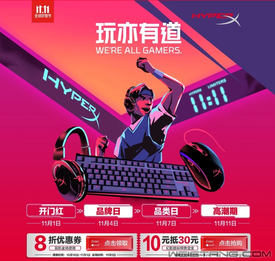 往年双11的暖场仅仅是提前数日,而今年的双11竟然把暖场再次前置,比如来自HyperX的专场大促,11月1日就拉开帷幕!诸多优惠券领到手软,诸多产品也迎来全年冰点价,还有各种晒单大礼等玩家来领取! 目前HyperX游戏耳机中高端产品的型号和促销优惠价格分别是: HyperX Cloud Orbit夜鹰游戏耳机,当前价格1999元;HyperX Cloud Mix天际蓝牙游戏耳机,当前售价999元;HyperX Cloud Alpha S阿尔法加强版游戏耳机,当前价格899元; HyperX Cloud Revolver S黑鹰加强版游戏耳机,当前价格599元,优惠幅度已超过5折。 不容错过的明星战队同款 对于HyperX的忠实用户而言,战队就是他们的Superstar,战队同款也是他们追逐的游戏装备。 VG PUBG战队同款当属人气最高、最具性价比的无线游戏耳机HyperX Cloud Stinger Wireless毒刺无线版(PC)游戏耳机,50mm超大驱动单元,2.4GHz无线无延迟设计,一次充电续可航17小时。目前售价399元,可谓相当超值! ARK MAD98同款包括HyperX Cloud Flight天箭无线游戏耳机、HyperX Alloy FPS Pro阿洛伊专业版游戏机械键盘和HyperX Alloy Elite RGB阿洛伊精英版RGB游戏机械键盘等。其中,天箭无线游戏耳机自带LED酷炫灯效,最长续航时间高达30小时,封闭式耳罩带来沉浸式游戏音效,清晰的高、中、低音带来身临其境的游戏氛围。阿洛伊精英版RGB游戏机械键盘拥有CHERRY红轴、青轴和茶轴三个版本,设计有独立的多媒体按键和大尺寸音量滚轮,内置存储芯片还可保存三组自定义灯效和宏设置。阿洛伊精英版RGB游戏机械键盘目前售价已低至599元,优惠幅度已超过5折,如此好价绝不可错过! 晒单赢价值5000元电竞套装 11月1日-11日购买HyperX产品的用户,只要在11月24日23:59:59前,将京东ID、2张以上产品照片及有效订单信息截图发送到金士顿官方微信公众号(kingston1987),金士顿将从符合条件的用户中抽取一等奖1名,二等奖3名,三等奖50名。获奖名单将于12月9日前通过金士顿官方微信公布,获奖用户需在12月9日前将有效联系方式、送货地址发送至金士顿官方微信公众号,12月23日前将奖品全部寄出,逾期发送有效联系方式和送货地址视为主动放弃奖项(具体规则以电商页面为准)。 为保证抽奖公正性,抽奖标准设置为:11月12日全国体育彩票“排列3”三位开奖数字的差值绝对值最小的54名用户为中奖用户,差值绝对值相同则较早发送订单截图至金士顿官方微信公众号用户为先。 双11大促已经火热进行中,这一阶段的好价活动力度也不容忽视,按照往年惯例,部分产品的优惠力度甚至超过双11当天,所以,心动就抓紧行动,清空你的购物车! 更多优惠信息可参考京东HyperX双十一活动页面链接: 关于HyperX HyperX拥有骇客神条、固态硬盘、USB闪存盘以及游戏耳机、键盘、鼠标等顶级产品。HyperX专为游戏玩家、超频爱好者和硬件发烧友量身打造,以优秀的质量、出色的性能和不断创新闻名全球,在全球累计销售了6500万套内存产品、1000万套耳机产品和100万套游戏键盘。HyperX也致力于电竞运动的推广,累计在全球赞助超过20支电竞队伍。例如在ChinaJoy、PAX、Davao Cyber Expo和 TGS & Big Fest等各大游戏展中均能看到HyperX的身影。 欲了解更多产品信息,请浏览HyperX中文官方网站: http://www.hyperxgaming.com 欢迎关注HyperX俱乐部微博(http://www.weibo.com/HyperXclub)与微信公众平台(微信号:HyperXclub),参加最新活动,交流产品心得。 |