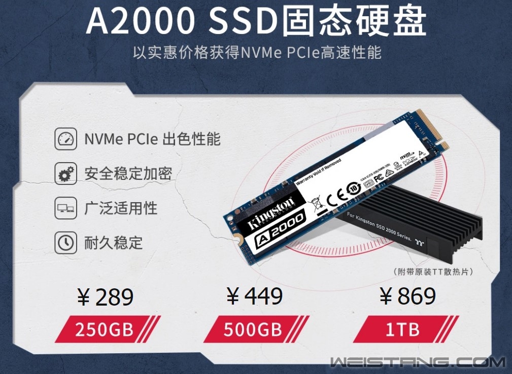金士顿2000系列固态硬盘终于等到正式发售的日子,凭借强劲的性能,以及相对平民的价格,上市发售便赢得消费者好感。如果主板有M.2接口,毫无疑问, 首选一定是金士顿2000系列固态硬盘。 A2000重新定义性价比 首先,M.2接口仅仅是一个接口,同时可以支持NVMe协议的PCIe通道,或者是普通的SATA通道。金士顿A2000 M.2 NVMe固态硬盘采用NVMe PCIe Gen3.0×4通道接口,PCIe Gen3.0每条lane速度为8Gbit/s,x4意味着将达到32Gbit/s,远高于SATA 6Gbit/s接口。 至于价格方面,A2000固态硬盘的性价比极高,当前SATA接口的250GB固态硬盘,特别是高性能的固态硬盘,读写速度在500MB/s以上的,售价一般都在300元以上。即便是规格相近的M.2 NVMe固态硬盘的价格也会在400元以上。而金士顿A2000固态硬盘的价格现在京东闪购的价格只有区区289元,性价比极高。即便500GB版本的价格也只有449元,依然有着极高的性价比。 发烧级KC2000也有性价比 发烧级的产品,往往性能仅仅提升一点,售价也会大幅攀升,但是金士顿KC2000 M.2 NVMe固态硬盘是个例外,相比A2000固态硬盘来说,KC2000固态硬盘的性能再提升,读写性能最高可达3200MB/s和2200MB/s, KC2000 250GB售价349元,500GB售价599元,1TB售价1089元。KC2000 M.2 NVMe固态硬盘具有350K的IOPS极致4K表现,1.2PBW总写入量提供耐久稳定的性能保障,更重要的是比同级别的产品便宜100-400元不等。 双11大促 送TT散热器赢5000元游戏套装 购买金士顿A2000和KC2000的用户,还将获得来自著名散热器品牌TT量身定制的高效散热片,高效散热确保固态硬盘性能高速持久发挥,连续高速读写和长时间游戏性能依旧强劲。 另外,大促期间购买A2000和KC2000固态硬盘的用户,只要在11月24日23:59:59前,将京东ID、2张以上产品照片及有效订单信息截图发送到金士顿官方微信公众号(kingston1987),金士顿将从符合条件的用户中抽取一等奖1名(价值5000元RGB游戏装备套装),二等奖3名,三等奖50名。获奖名单将于12月9日前通过金士顿官方微信公布,获奖用户需在12月14日前将有效联系方式、送货地址发送至金士顿官方微信公众号,12月23日前将奖品全部寄出,逾期发送有效联系方式和送货地址视为主动放弃奖项。 对于两个系列的固态硬盘,双11期间购买不仅性价比出众,还有高端赠品,动动手晒单更可能赢取价值5000元的RBG游戏装备套装,所以,只要主板带M.2接口,选金士顿A2000或者KC2000一定没错! 金士顿A2000 M.2固态硬盘京东商城购买链接: https://item.jd.com/100008763676.html 金士顿KC2000 M.2固态硬盘京东商城购买链接: https://item.jd.com/100009123124.html 欲了解更多金士顿产品信息,请浏览金士顿中国官方网站: http://www.kingston.com/cn 欢迎关注金士顿官方微博(http://weibo.com/kingston1987)与微信公众平台(微信号:Kingston1987),参加最新活动,交流产品心得。 |