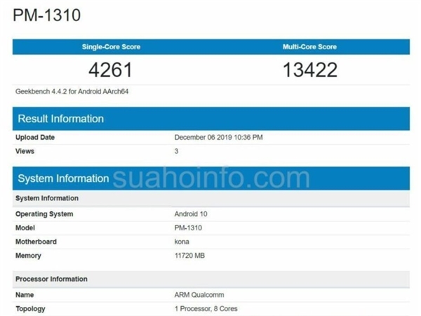 12月10日消息,据外媒报道,索尼下一代Xperia旗舰可能会命名为Xperia 3或者是Xperia 1.1,该机搭载高通骁龙865旗舰平台,配备12GB内存。 据悉,型号为PM-1310的新机现身GeekBench跑分网站。从表面上看,该机似乎与索尼并没有什么联系。 但是PM-1310与此前索尼移动服务器上出现的型号PM-1310-BV相吻合,由此猜测它PM-1310可能是手机OEM的ID(Xperia 1 OEM ID为PM-122-BV)。 报道指出,Xperia旗舰将提供四个版本,其中一版支持5G,这将是索尼旗下首款5G手机。 另外,有消息称索尼正在研发一款六摄手机,它后置镜头数量达到了6颗,比诺基亚9 PureView还多一颗。遗憾的是,关于该机的细节暂时不得而知,至于它是否会命名为Xperia 3或者是Xperia 1.1尚无定论。 按照惯例,索尼每年会在MWC、IFA两大盛会上公布Xperia旗舰。由此猜测,下一代Xperia旗舰有望在MWC2020上亮相,搭载骁龙865几乎没有什么悬念,我们拭目以待。 |