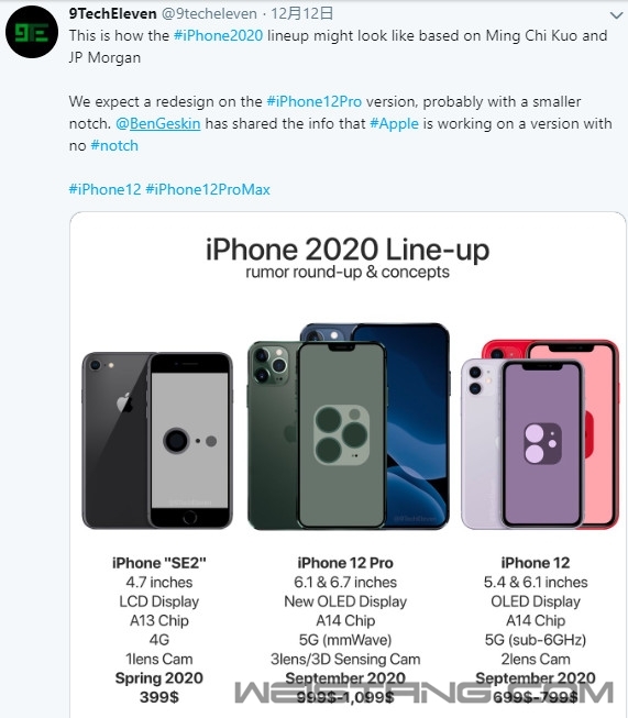 今年苹果在5G进程上慢了一步,iPhone 11系列全系仅支持4G,让明年的5G iPhone备受期待。 日期,外媒9TechEleven根据天风国际分析师郭明錤以及摩根大通的预测报告,制作了一组iPhone 2020产品线的渲染图,一共5款。鉴于前二者的预测准确性以及可靠度,这图渲染图的外形颇具参考价值。 按照此前郭明錤的说法,2020年,苹果将发布5款新iPhone,4款支持5G(iPhone 12系列),尺寸从4.7英寸-6.7英寸不等。4.7英寸版本外观像iPhone 8(iPhone SE2),其余4款外观重回iPhone 4。 从图中来看,5G iPhone将分为iPhone 12系列(699美元-799美元)、iPhone 12 Pro系列(999美元-1099美元),均搭载A14处理器,2020年9月发布。 其中,iPhone 12系列包括:5.4英寸OLED iPhone (后置双摄)、6.1英寸OLED iPhone (后置双摄); iPhone 12 Pro系列包括:6.1英寸OLED iPhone (后置三摄+ToF) 与6.7英寸OLED iPhone (后置三摄+ToF)。 从外形来看,iPhone 12 Pro系列的设计更新,刘海更小。iPhone 12则会延续当下iPhone 11系列的外形,增加到双摄。 据悉,4款5G iPhone均配备高通X55基带,同时根据不同国家发售支持Sub-6G或Sub-6G+mmWave的机型。 针对没有5G,或者普及率很低的国家和地区,苹果可能会用软件关闭Sub-6G iPhone机型5G功能,以降低采购X55基带的成本。 另外还有一款iPhone SE2,采用4.7英寸LCD屏幕,A13处理器、单摄,2020年春季发布,售价399美元起。 或许,没有刘海的iPhone,才是最完美的iPhone |