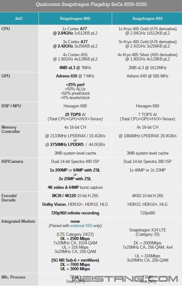 Anandtech网站对于骁龙865处理器的基本介绍跟之前我们写过的报道差不多,毕竟都是官方资料,这点不再赘述,其实他们做的规格表就非常详细了,如上所示。 简单来说,骁龙865可以看做骁龙855的全面升级版,制程工艺从台积电的第一代7nm(N7)升级到了第二代7nm(N7P),CPU还是1+3+4三簇架构,但大核全面升级到Cortex-A77架构,频率不变,GPU则从Adreno 640升级到Adreno 650,性能增强了25%,Anandtech没提及具体频率,不过网络爆料称GPU是587MHz。 其他方面,AI性能从7TFLOPS提升到了15TFLOPS,翻倍还多,ISP图形传感器也支持到了2亿像素,视频拍摄也多了8K、960帧慢动作等新功能。 |
