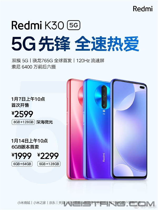 1月6日消息,小米集团中国区总裁、Redmi品牌总经理卢伟冰预告,Redmi K30 5G将于1月7日上午10点正式发售。 需要注意的是,1月7日发售的版本是2599元(8GB+128GB),6GB+128GB版本和6GB+64GB版本将于1月14日上午10点首卖,售价分别是2299元和1999元。 和4G版对比,Redmi K30 5G版规格大体一致。它采用6.67英寸双孔全面屏,搭载高通骁龙765G移动平台,最高配备8GB内存+256GB存储,前置2000万+200万AI双摄,电池容量为4500mAh,支持30W疾速闪充(Redmi K30 4G版支持27W快充),支持NFC。 此外,Redmi K30 5G可以实现三网并发,2.4GHz WiFi+5GHz WiFi+5G/4G移动网络。卢伟冰科普,这好比我们把网速“运输车”从1辆直接增加到3辆,保证高速、稳定的网络连接体验。 相机方面,Redmi K30 5G首发索尼IMX686,具体由6400万(IMX686)主摄+800万超广角+500万超微距+200万景深四摄组成,加入了超级夜景模式。 卢伟冰强调,K30 5G的夜景真的不输给四五千元的拍照旗舰。它采用的是最新RAW域夜景算法,直接在RAW域下完成多帧堆栈,相比普通YUV输入信息更多,能够更好还原夜晚细节并且抑制噪点。 |