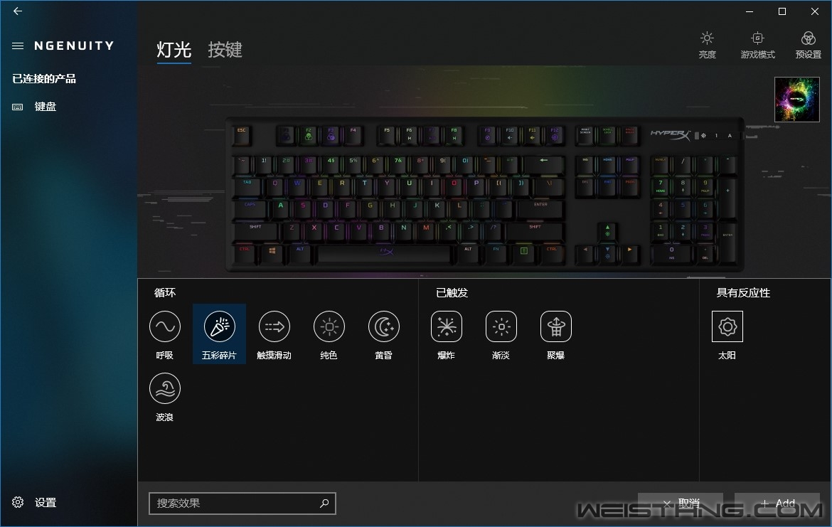 机械键盘一直都是游戏玩家的最爱,拥有一把手感出众的游戏键盘对胜利绝对是事半功倍的效果。然而,玩家的需求并不仅仅局限于手感,还要有个性化的灯光效果,不仅有实力还要有颜值! HyperX Alloy Origins 起源RGB游戏机械键盘不仅满足了玩家对手感的追求,更有市面上最酷炫的RGB动态光效,并且,光效是可以自定义的。拥有这款键盘的玩家戏称,“有了这个自定义功能,我能玩一年”。 照亮整间房 外露LED显威 起源RGB游戏机械键盘采用HyperX自有机械键轴,并且带有璀璨夺目的外露LED,这样最大的好处在于保留了机械键盘的舒适手感的同时,使LED光源更明亮、更耀眼,这也是为什么起源RGB游戏机械键盘比其它背光键盘更亮的原因。即便是在白天光线明亮的场所,其所散发的光效依然闪亮。并且,亮度还有5级调节,夜晚甚至可以点亮整个房间,当然玩家也可以适当减弱亮度,调整成自己认为最舒适的亮度。 无个性 不NGENUITY HyperX的专业定制软件NGENUITY(下载地址:https://www.hyperxgaming.com/cn/ngenuity,安装后更新键盘固件即可使用)对于HyperX的玩家已经非常熟悉,无论是耳机、键盘、内存、鼠标,甚至鼠标垫均可设置灯光和灯效,不仅功能强大而且简单直观,设置完毕即可呈现光影效果。 比如春节期间,燃放烟花的五彩缤纷效果也可以呈现在键盘上,也正是因为有自定义软件,才让更多想法可以付诸实现。首先打开NGENUITY软件,在灯光选项中有循环预设,其中与春节烟花最应景的就是“五彩碎片”,让每一个字母、字符都有不同的色彩,彻底告别单一的色彩,让键盘也可以像烟花一样绽放。 除了这个“烟火”效果之外,还更多可设置的操作,比如颜色的选择,有人偏爱红色,有人偏爱蓝色,都可以有针对性的设置, 并且,灯光的透明度、速度,以及亮光模式都可以自定义,比如呼吸模式、触摸滑动、波浪模式等等。重要的一点是,各种光效是可以叠加使用的,如此一来光效可以千变万化,轻松打造出绝无仅有的个性光效。 对于自己满意的自定义模式,还可以将效果存储在键盘内置芯片中,最多可以存储三种模式,即便以后不在这台主机依然可以随时调用自己的自定义光效,非常适合外出比赛使用。 自主轴体 有颜值更有实力 起源RGB游戏机械键盘的颜值不用多说,但是键盘最终还是要用的,无论是打字还是打比赛,舒适是第一要素。这款采用的是HyperX自主轴体,按键压力45克,键程更短,响应时间只有1.8ms,并且提供了高达8000万次的按键寿命,相比薄膜键盘800-2000万次的键盘寿命,机械键盘正常使用10-20年没有丝毫问题。 还有很多细节也值得肯定,首先是坚固性,它采用了金属框架,虽然成本会高很多,但是耐用性大大增强;其次是舒适性,精心打造的键帽幅度贴合指尖,带来舒适顺畅的敲击手感,键盘拥有三个调节角度,满足大部分用户的使用习惯;最后是便携性,方便可拆卸的线缆率先采用了Type-C接口,让战队外出比赛携带也更从容、简单。 有颜值,有实力,坚固耐用寿命长,拒绝雷同彰显个性色彩,这就是起源RGB游戏机械键盘。对于每一位游戏玩家,这款键盘都是值得拥有的终极武器。 HyperX Alloy Origins 起源RGB游戏机械键盘京东商城购买链接: https://item.jd.com/100008650408.html HyperX拥有骇客神条、固态硬盘、USB闪存盘以及游戏耳机、键盘、鼠标等顶级产品。HyperX专为游戏玩家、超频爱好者和硬件发烧友量身打造,以优秀的质量、出色的性能和不断创新闻名全球,在全球累计销售了6000万套内存产品和700万套耳机产品。HyperX也致力于电竞运动的推广,累计在全球赞助超过20支电竞队伍。例如在ChinaJoy、PAX、Davao Cyber Expo和 TGS & Big Fest等各大游戏展中均能看到HyperX的身影。 欲了解更多产品信息,请浏览HyperX中文官方网站: http://www.hyperxgaming.com 欢迎关注HyperX俱乐部微博(http://www.weibo.com/HyperXclub)与微信公众平台(微信号:HyperXclub),参加最新活动,交流产品心得。 |
