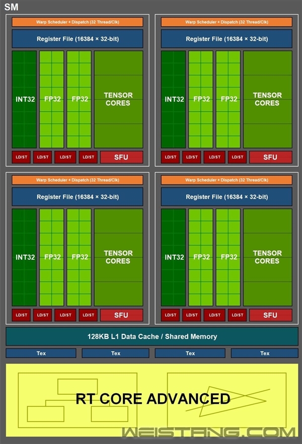 3月23日的GTC大会可能是NVIDIA正式揭晓新一代GPU架构的窗口时间。本周,名为KittyCorgi的爆料新人公布了不少Ampere(安培)核心的技术资料,虽说真实性还有待作证,但也不妨先瞧一瞧。 依据这份爆料,Ampere GPU核心面积高达826mm2,如果基于7nm打造的话,晶体管规模将相当恐怖。 具体到内部,对应RTX 3080 Ti的“GA103”核心分为6组GPC单元,每组GPC拥有10个SM单元,一共是60个SM单元,3840个CUDA(若是一个SM单元增加到128个CUDA,那就是7680,基于核心面积,后者可能性倒是更大),显存位宽320bit。此前,RTX 2080 Ti的TU102是72个SM单元,有效68个,总计4608个CUDA。 对应RTX 3080的“GA104”核心同样是6组GPC,每组GPC削减为8个SM单元,一共是48个SM,3072或6144个CUDA,256bit显存位宽,都支持PCIe 4.0。 回到SM单元内部,INT32单元不变,FP32规模翻倍,Tensor Core翻倍,L1增大,光追单元升级为RT Core Advanced。 期待老黄尽快揭晓Ampere、Hopper…… |