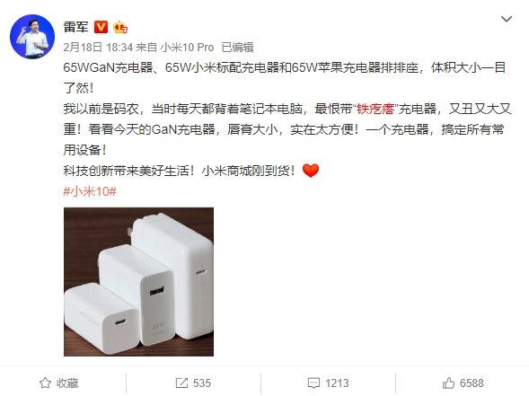 小米10发布会上,小米还带来了旗下第一款采用GaN氮化镓材料的充电器,官方名称“小米GaN充电器Type-C 65W”,售价149元。对一块4500mAh的超大电池从0%充电至100%仅需45分钟,小米就此也成为了第一家将氮化镓USB PD快充单独零售的品牌手机企业,并且149元的零售价更是创下行业新低,引发业内人士高度关注。 经过2月18日的首销之后,今天10点,该充电器在小米商城再次开卖。 65W小米GaN充电器主要核心卖点有三:1、采用新材料:GaN氮化镓,充电效率效率更高;2、精致外观,小巧体积,携带方便;3、可以充手机,也可以充笔记本,智能兼容多数设备,出门带一个就够。 这充电器采用了GaN,也就是氮化镍材料,作为第三代半导体,氨化等的加入可以让充电器在同样功率档位的情况下有更高的效率,发热更少,最终让整个充电器产品在体积小巧方面有突破性的进展。相比小米非氮化镓的65M充电器体积减少近四成。 采用氮化镓材料后,小米充电器USB-C 65W的体积比小米笔记本标配的适配器缩小了48%,携带更方便,搭配小米10 Pro可提供最高50W充电功率,45分钟即可充入100%。 此前雷军在微博上科普氮化镓充电器的好处 该充电器支持小米疾速闪充、PD 3.0等快充协议,多个档位智能调节输出电流,也兼容iPhone快充技术,iPhone 11充电速度比原装5W充电器快大约50%,同时也可以为大多数USB-C接口的笔记本其他设备充电,甚至连Switch都不在话下。 套装中还附带小米USB-C转USB-C数据线,集成E-Marker芯片,最大支持5A电流,充电速度更快。 小米GaN充电器Type-C 65W体积小巧,产品尺寸: 30.8× 30.8 x 56.3mm(不含插脚),类比其他产品差不多等于四节五号电池的大小,一手可握,轻松携带。 |