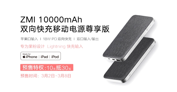 3月2日消息,紫米10000mAh双向快充移动电源尊享版将今日开启预售,苹果MFI输入,PD18W双向快充,专为果粉打造,售价169元,将于3月8日正式开售。 紫米10000mAh双向快充移动电源尊享版通过了苹果MFi官方认证,采用Lightning口快充输入,输入功率可达15W,只需携带一根苹果充电线即可为移动电源供电,也可为苹果手机充电。 它还提供USB-A和Type-C两种输出接口,可同时为两台设备充电,双口同时输出最大功率可达15W。搭配ZMI USB-C to Lightning数据线可为iPhone 11提供18W快充,充电速度比普通5V/1A充电器快了50%。 除了手机、平板等设备外,,它可为蓝牙耳机、手环等小电流设备充电,解决日常生活中小电流设备的充电需求。 此外,它采用高密度聚合物电池,优化了控电芯片,提升充放电效率的同时提供多重电路保护。具体包括温度保护、短路保护、Reset保护、输入过压保护、输入防反保护、输出过流保护、输出过压保护、电池过充过放保护、硬件级电池过流短路保护等等。 |