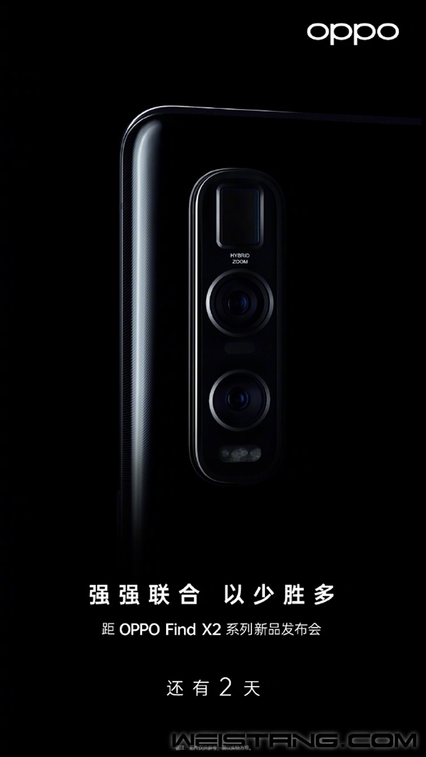 3月份,旗舰扎堆,疫情之下,线上发布成了主流。在即将发布的旗舰机中,除了3月26日的华为P40,关注度最高的就要数3月6日亮相的OPPO Find X2系列。作为经典Find系列的顶级旗舰,OPPO的投入自然十分下本。 继屏幕细节、外观相继公布之后,今日OPPO放出一项新机后置摄像头的预热海报:“强强联合,以少胜多。距#OPPO Find X2#系列线上新品发布会,还有2天! ” 海报稀松平常,但又觉得哪里不对——作为一款2020年的旗舰机,OPPO Find X2竟然用了后置三摄。 目前,多数旗舰都以标配四摄,虽然摄像头的数量并不能说明问题,但在普通用户印象里依然是“多胜于少”。 不过,OPPO Find X2此次却反其道而行之,只给了三个摄像头。另外,海报细节显示,三枚摄像头中,二圆一方,其中一枚举行摄像头下方有HYBRID ZOOM的标识,支持混合变焦。 此前,蓝牙SIG组织的认证资料显示,Find X2系列有两款SKU,预计定名X2和X2 Pro。Find X2型号CPH2023,骁龙865处理器,6.7英寸WQHD+显示屏,后置4800万+1200万+1300万三摄,前置3200万像素自拍镜头,支持蓝牙5.1。 Find X2 Pro型号CPH2025,骁龙865处理器,6.7英寸WQHD+显示屏,后置4800万+4800万+1300万三摄,前置3200万像素自拍镜头,支持5G,蓝牙5.1。 坦白说,但从镜头像素规格来看,并不出众。但OPPO既然“强强联合,以少胜多”的口号,相信自有其能耐之处,以三摄胜四摄? 已知消息显示,OPPO Find X2采用打孔曲屏设计,屏占比极高。全系标配3K分辨率、120Hz屏,支持视频动态插帧,可将30帧以下视频内容提升至60帧甚至120帧,并支持HDR视频画质增强,通过了HDR10+认证。 |