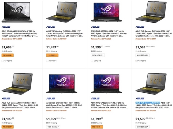 今年年初的CES上,AMD正式发布了全新锐龙4000系列APU,含锐龙7 4800U、锐龙5 4600H、锐龙7 4800H、锐龙7 4800HS等多款低压、标压移动处理器产品。 随着时间进入3月份,搭载锐龙4000APU的产品也终于即将上市,近日,据外媒报道,国外电商网站Newegg加拿大上架了多款锐龙4000系列笔记本,部分已经开始预售,网站标记的开售时间为3月16日。 换句话说,3月中旬我们就能买到锐龙4000笔记本了! 上架的新品全部是华硕游戏本产品,型号共分4款,分别是华硕TUF Gaming TUF506I、华硕TUF Gaming TUF706I、华硕ROG GA502I、华硕ROG GA4011U,部分SKU具体规格如下: 其中华硕TUF Gaming TUF706IH为17.3英寸游戏本,配置为120Hz刷新+锐龙7 4800H+GTX 1660Ti的组合; 华硕TUF Gaming TUF506I为15.6英寸游戏本,配置为144Hz/60Hz刷新+锐龙7 4800H/锐龙5 4600H+RTX 2060/GTX 1650的组合; 华硕ROG GA502I为15.6英寸游戏本,配置为240Hz/144Hz刷新+锐龙7 4800HS+RTX 2060/GTX 1660Ti的组合; 华硕ROG GA4011U为14英寸游戏本,配置为120Hz刷新+锐龙7 4800HS+GTX 1660Ti Max-Q的组合。 价格最低的一款游戏本起售价899加元,价格最高为1799加元,约合人民币4560元-9125元,性价比相当可观。 |