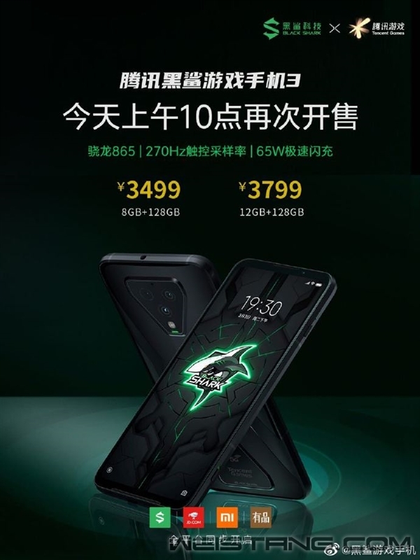 今天上午10点,腾讯黑鲨游戏手机3 12G+128G版即将开售,售价3799元。8G+128G版本持续热卖中。 黑鲨游戏手机3共有3个版本:8+128GB版售价3499元,12GB+128GB版3799元,12+256GB版3999元。12GB内存能体验到最佳的性能,对于存储需求不高的用户,12GB+128GB版是不错的选择。 黑鲨3采用了绝对对称的设计理念,提供4种配色:闪电黑、铠甲灰、星辰银、璀璨粉,其中璀璨粉是这一代新增的配色,小姐姐们也有自己的游戏手机了。 黑鲨配备6.67寸AMOLED显示屏,支持270Hz触控采样率,目前全球最高,游戏中开枪反应更快。支持90Hz及MEMC运动补偿,同时升级到屏幕压感3.0,传感器数量增加到了4颗,压感面积提升48%。 性能方面,黑鲨3搭载高通骁龙865处理器,支持双模5G,支持三大运营商的全频段网络。内置最高12GB内存,全系标配UFS 3.0闪存。配备了4720mAh电池,并且支持65W闪充,38分钟即可充满。 值得一提的是,黑鲨专为5G游戏打造了三明治液冷散热系统,配备了总长约186mm的液冷管,相比上一代,热源散热面积提升100%,散热能力提升50%。 购买链接:京东(3799元) |