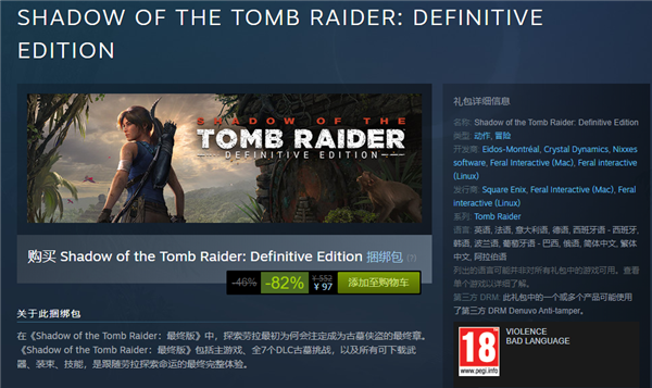 《古墓丽影:暗影 最终版》在Steam上开启了“终极打折”活动,原价552元,现在只卖97元,相较原价减免了82%,2折的劳拉大家不要错过了。 据了解,《古墓丽影:暗影 最终版》包括主游戏、全7个DLC古墓挑战,以及所有可下载武器、装束、技能,是跟随劳拉探索命运的最终完整体验。 购买地址:点此。 在世界上最致命的地点生存下来:征服残酷无情的丛林,并活着走出来。探索充满裂隙和幽深隧道的水下环境。 与丛林合而为一:火力不足、以寡敌众的劳拉,必须充分利用丛林中的环境,像美洲豹一样迅猛出击、悄然而退,使用泥浆作为伪装手段,在敌人队伍中制造恐惧,播撒混乱。 探索黑暗残忍的古墓:古墓变得比以往更加恐怖,需要细致谨慎的探索技术才能到达,还要以智慧破解杀机重重的谜题。 揭露鲜活的历史:发现隐秘之城,探索系列作游戏中空前庞大的据点空间。 |
