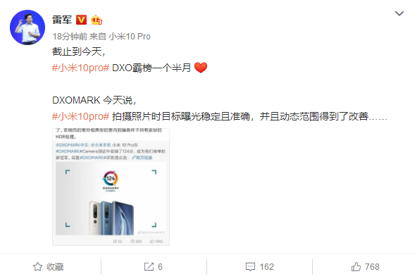 DxOMark评分已经成为众人皆知的手机拍照能力标杆,小米去年凭借小米CC9 Pro获得了并列第一的好成绩,而小米10 Pro从2月13日发布后就是第一,目前都没有手机超过它。 DxOMark中文官方微博今天下午再次转发了小米10 Pro的DxOMark评分,表示“小米10 Pro拍摄照片时目标曝光稳定且准确,并且动态范围得到了改善,在困难的高对比度场景中高光剪切减少了,在明亮的室外和典型的室内拍摄条件下具有更好的HDR处理。” 雷军随后发了这条微博,提到小米10 Pro已经霸榜一个半月了——似乎意有所指? 不过目前确实是这样,小米10 Pro的124分依然是最高的,只有Find X2 Pro以124分并列第一。 在DxOMark榜单上,小米10 Pro取得了总分124、拍照分134、视频分104的优异成绩,三项全都是第一,另外纹理(85)、变焦(110)、广角(42)等子项同样是第一。 不仅如此,小米10 Pro的音频也很强悍,在DxOMark音频排行榜上,小米10 Pro也轻松拿到第一,总分为76,其中播放77、录音71。 |