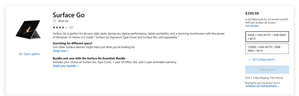 业界原本以为Surface Go 2、Surface Book 3等新品会在3月份亮相,然而受疫情影响,上述新品并未如期发布。 4月10日消息,据外媒报道,受疫情影响,Surface新品可能要等到下个月才能发布了。 如今微软美国官网显示Surface Go已经售罄,这意味着新品Surface Go 2即将登场。 之前有爆料称微软Surface Go 2至少有两种配置,一种是搭载英特尔酷睿m3-8100Y处理器,核显为UHD 615,配备8GB内存和256GB SSD。 一种是搭载英特尔奔腾4425Y处理器,核显为UHD 615,配备8GB内存+128GB SSD。 爆料指出,Surface Go 2的整体造型与Surface Go区别不大,屏幕尺寸为10英寸,分辨率为1800×1200,预计售价与Surface Go保持一致,可能是399美元起(约合人民币2800元)。 值得注意的是,目前Surface Book 2微软美国官网仍然有现货,提供酷睿i5、i7等型号,有8GB内存+256GB存储和16GB内存+512GB存储等选择。 新一代Surface Book 3可能会在下个月登场,我们拭目以待。 |