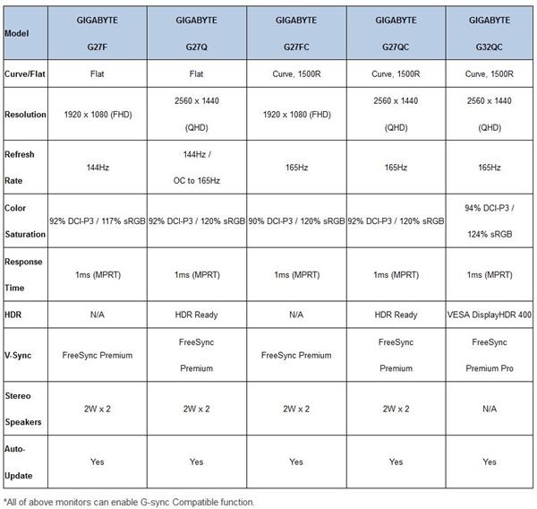 近日,据外媒报道,技嘉推出了5款全新电竞显示器——技嘉G27F、G27Q、G27FC、G27QC、G32QC。 其中技嘉G27F与G27Q是两款直屏显示器,均搭载了27英寸IPS屏幕,其中G27F为1080P分辨率最高144Hz刷新,G27Q为1440P(2K)分辨率最高165Hz刷新,前者覆盖了92%的DCI-P3色域与117sRGB色域,后者覆盖了92%的DCI-P3色域与120sRGB色域(还支持HDR),1ms响应时间。 两者还均支持FreeSync Premium,兼容G-sync,内置2个2W扬声器。 而技嘉G27FC、G27QC、G32QC是3款曲面显示器,曲率1500R,分辨率分别为27寸1080P,27寸1440P,32寸1440P,刷新率同样为165Hz。 三者覆盖色域也稍有不同,分别覆盖了90%/92%/94%DCI-P3色域,120%/120%/124%sRGB色域。 三者均支持FreeSync Premium(G32QC支持FreeSync Premium Pro),G27QC、G32QC支持HDR,后者规格更高支持VESA HDR 400标准。 这5款显示器将于2020年第二季度推出,价格则尚未公布。 |