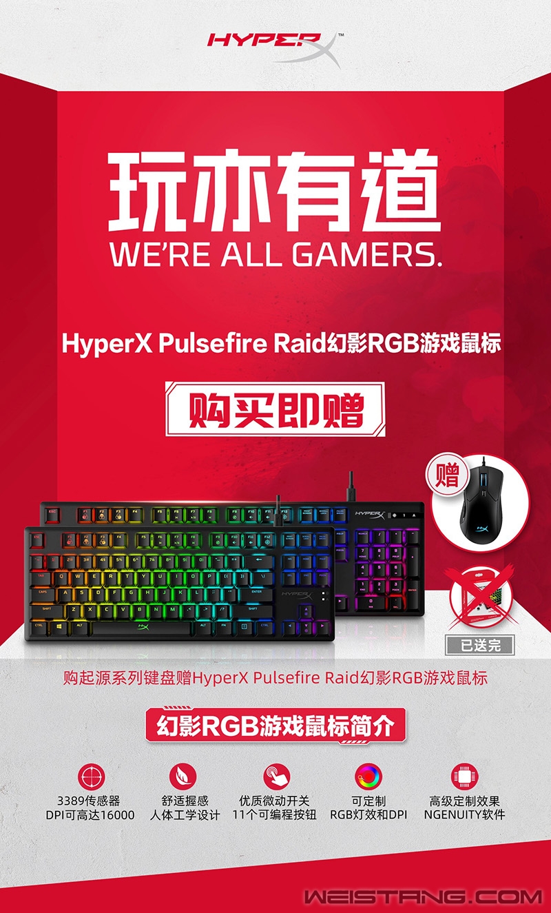 616、617、618、终于等到一年一度的天猫6.18!很多玩家对心仪的HyperX游戏外设酷品早已了然于心,领券、加购,憧憬拥有全套HyperX装备后的理想生活,耐心等待天猫6.18放价的那一刻! 赢魅影游戏键盘 幸运抽奖好运连连 6.18期间,天猫HyperX旗舰店为玩家准备了丰富的见面礼——参加店铺幸运抽奖,就有机会获得HyperX Alloy Core RGB阿洛伊魅影RGB游戏键盘大奖,此外还有HyperX抽绳包、HyperX开瓶器,以及诸多满减优惠券。 HyperX阿洛伊魅影RGB游戏键盘是一款高性价比的外设产品,结实的框架结构搭配了极富动感的灯效,贴心的防泼溅设计,让玩家无需担心意外发生,灵敏舒适的按键让操作行云流水。如此出色的键盘,现在有机会免费获取,还不赶紧来试试运气! 除了有机会赢取HyperX阿洛伊魅影RGB游戏键盘之外,HyperX还开展了免费试用活动。在6.18活动期间, 只需提交申请,就有机会获得免费试用HyperX Alloy FPS RGB阿洛伊RGB游戏机械键盘,经典的机械手感,让你游戏中的走位行云流水,在战斗中横扫千军。 HyperX阿洛伊RGB游戏机械键盘最大的特色就是采用了手感出色的机械银轴,拥有可自定义的炫彩RGB动态光效,紧凑的设计让外出携带更方便,板载存储宏功能可以一键切换预设,让它随时随地与你保持默契! 买起源系列键盘送幻影游戏鼠标 如果说前两个活动有运气的成分,那么接下来的买键盘1:1赠送鼠标的活动,只需要拼手速就能将大礼收入囊中!6月16日-6月20日活动期间,购买HyperX Alloy Origins起源RGB游戏机械键盘(水轴、红轴)或HyperX Alloy Origins Core起源竞技版RGB游戏机械键盘(水轴、红轴),就送HyperX Pulsefire Raid幻影RGB游戏鼠标,数量有限,送完即止,欲购从速哦! HyperX幻影RGB游戏鼠标是目前HyperX的旗舰级游戏鼠标之一,采用高性能的原相3389传感器,DPI最高可达16000,并且拥有11个可编程按钮,让游戏化繁为简,助力玩家轻松赢取最终的胜利。并且,幻影RGB游戏鼠标还拥有可定制RGB灯效功能,与起源系列键盘搭配,让你的桌面变得流光溢彩! 无线套餐超划算 加送无线充电板 活动期间,HyperX还有四套特惠的无线套餐可供选择,Pulsefire Dart标枪RGB游戏鼠标搭配四款不同定位的无线耳机,套餐不仅价格非常优惠,现在购买还加送无线充电板!让你彻底摆脱线缆的束缚,享受无线自由和随时开战的快感! 四款无线耳机各有特色,总有一款可以满足玩家最苛刻的需求。HyperX毒刺无线版是一款高性价比的无线游戏耳机,拥有经典的设计和丰富的功能;HyperX毒刺灵动版7.1无线游戏耳机则拥有虚拟7.1环绕声功能,看大片与打游戏两不耽误;HyperX天箭无线游戏耳机拥有30小时超长电池续航时间,90°旋转耳罩使用起来更方便,炫酷的LED灯效可彰显个性的风格;HyperX天箭加强版无线游戏耳机则提供了Qi无线充电功能,日常使用更便捷。 套餐中的标枪RGB游戏鼠标是HyperX无线鼠标中的旗舰级产品,采用原相3389传感器,DPI高达16000,并且有着媲美有线鼠标的低延迟无线技术,快至1毫秒的响应速度保证在使用中流畅无卡顿。可定制的RGB动态光效,进一步提升了这款鼠标的颜值。50小时的超长续航时间,以及支持无线Qi充电功能,更是增加了无线“战斗”的时长和充电的便利性。 除了这些特惠产品之外,参与店铺微淘互动和评论,也有机会抽取大奖;看直播还能赢取粉丝福利。这个6.18,锁定天猫活动页面,让HyperX为你的理想生活大放价,成就你的热爱! 天猫HyperX旗舰店链接: https://hyperx.tmall.com/?spm=a1z10.1-b-s.1997427721.d4918089.2e0029dcDe7dCq 关于HyperX HyperX拥有骇客神条、固态硬盘、USB闪存盘以及游戏耳机、键盘、鼠标等顶级产品。HyperX专为游戏玩家、超频爱好者和硬件发烧友量身打造,以优秀的质量、出色的性能和不断创新闻名全球,在全球累计销售了6500万套内存产品、1000万套耳机产品和100万套游戏键盘。HyperX也致力于电竞运动的推广,累计在全球赞助超过20支电竞队伍。例如在ChinaJoy、PAX、Davao Cyber Expo和 TGS & Big Fest等各大游戏展中均能看到HyperX的身影。 欲了解更多产品信息,请浏览HyperX中文官方网站:http://www.hyperxgaming.com 欢迎关注HyperX俱乐部微博(http://www.weibo.com/HyperXclub)与微信公众平台(微信号:HyperXclub),参加最新活动,交流产品心得。 |