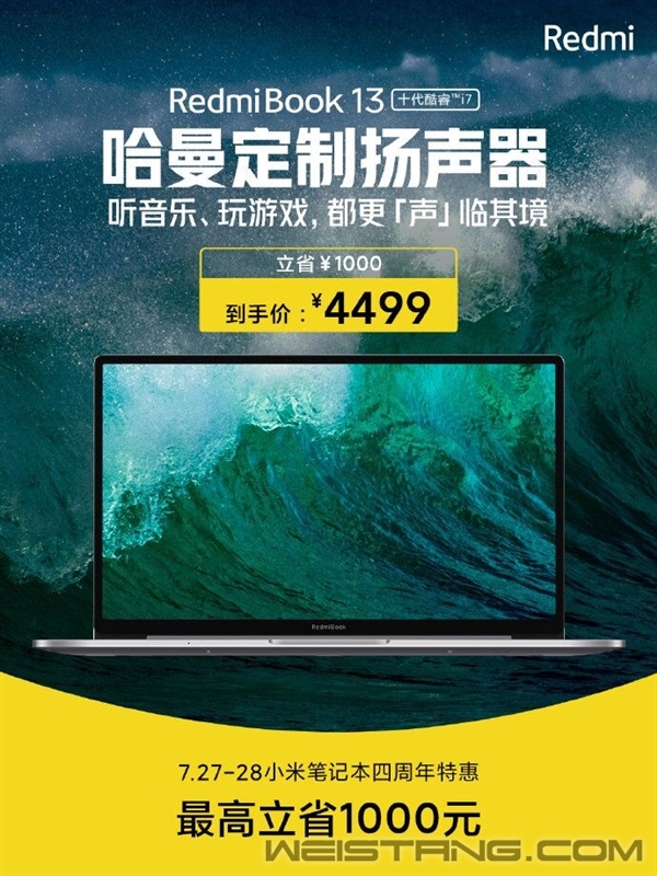 7月23日消息,小米笔记本官方微博宣布,小米笔记本四周年特惠,RedmiBook13十代酷睿i7版到手价仅4499元,活动时间于7月27日正式开启。 RedmiBook 13是Redmi打造的全面屏笔记本,它采用了四窄边全面屏设计,不仅顶部和左右边框收窄,下边框也缩短了48.9%,屏占比高达89%,同时整机重量仅1.23公斤。 核心配置上,RedmiBook 13基于Intel Comet Lake第十代酷睿平台,塞入独立显卡NVIDIA MX250,搭配DDR4内存和SSD固态盘,并有全新的飓风散热系统,定制羽翼风扇,0.1毫米超薄扇叶,6毫米双热管,全铜散热模组。 此外,智能互联、移动办公也是RedmiBook 13一大亮点,它支持跨平台小米互传、小米感应钥匙、小米云服务。 续航方面,RedmiBook 13内藏40Whr电池,足以支撑11小时的超长续航。同时支持1C快充技术,35分钟可充电50%,官方称仅需一顿午餐的时间即可高效使用一下午。 |