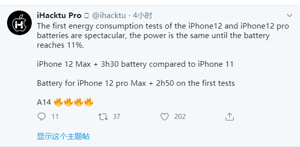 最近9月份,苹果就要推出iPhone 12系列5G手机了,这次会有四款iPhone 12,全线升级到A14处理器,用上台积电5nm工艺。 四款iPhone 12手机的硬件无疑会全面升级,但是电池容量可能又要开倒车了,之前爆料称iPhone 12电池相比iPhone 11反而降低了,韩国监管机构SafetyKorea的认证如下: iPhone 12(A2471)2227mAh、iPhone 12 Max(A2431)2775mAh、iPhone 12 Pro(A2479)2815mAh、iPhone 12 Pro Max(A2466)3687mAh。 和iPhone 11同型号相比,容量都有下降,而且降幅还不少。其中,iPhone 12少了883mAh,降幅超过28%。iPhone 12 Pro少了231mAh,iPhone 12 Pro Max少了282mAh。 不过话说回来,电池容量降低虽然让人不爽,但不代表iPhone 12的续航就一定变差,还要看实际使用表现。 今晚外网爆料iPhone 12首个电池续航测试,结果还是蛮让人惊喜的。 iHacktu Pro表示,iPhone 12及iPhone 12首个电池续航测试表现惊人,在达到11%电量之前,两者的功耗都是一样的。 与iPhone 11相比,iPhone 12 Pro的续航时间多了3小时30分钟,而iPhone 12 Pro Max也多了2小时50分钟。 总之,目前来看iPhone 12系列的续航应该还是有惊喜的,毕竟5nm A14处理器要比7nm的A13更省电,可以弥补电池降低导致的续航损失。 |