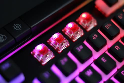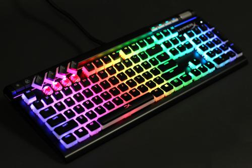 在红轴旁还有外露的LED灯,相比其他键盘,阿洛伊精英2游戏机械键盘的灯光更亮,配合双色键帽可以发挥1+1>2的效果,并且只有两者的结合才会碰撞出火花。这款键盘的RGB动态光效还可以通过HyperX NGENUITY驱动软件进行灯光和宏功能的个性化设置,不仅色彩可调,灯效的变换模式也可调,个性的自定义设置还可存储到键盘内置的芯片中,最多可保存3组预设,这样即便脱离原有主机,在没有驱动软件的支持下,也可以随时调用之前存储的预设。