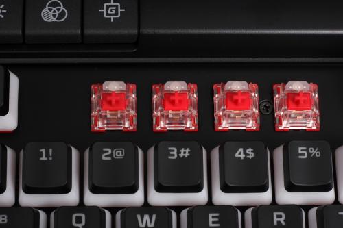 拔掉键帽,机械键盘的核心展露无遗——HyperX自主红轴。据官方数据,自主红轴属于典型的线性轴,触发行程1.8mm,总行程3.8mm,触发弹力45g,所以相比其他键轴,其行程短、速度快,非常适合游戏玩家对速度的追求。并且官方数据给出了8000万次的敲击寿命,耐用程度完胜目前其他主流轴体。