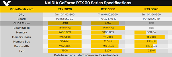 新品发布前总会有曝料,但是像VideoCardz这样直接把RTX 3080、RTX 3090的几乎所有核心规格都捅出来,RTX 3070也曝出一大部分的,实在不多见。 按照最新说法,NVIDIA将在9月份发布三款新卡,分别是RTX 3090 24GB、RTX 3080 10GB、RTX 3070 8GB,AIC厂商还在准备RTX 3080 20GB,但仍未最终敲定。 RTX 3090/3080的包装盒样式也已经设计好了: RTX 30系列将会基于Ampere安培架构,集成第二代RT光线追踪核心、第三代Tensor张量核心,支持PCIe 4.0、DisplayPort 1.4a、HDMI 2.1。 制造工艺据说是7nm,但还不能完全实锤,NVIDIA对这一点似乎讳莫如深——难道是三星8mm?甚至混用? RTX 3090核心编号GA102-300,PCB方案编号PG132 SKU 30,集成5248个CUDA核心,核心频率最高1695MHz,搭配384-bit 24GB GDDR6X显存,等效频率19.5GHz,带宽936GB/s,整卡功耗350W,公版是一个新的12针供电接口,非公则是至少两个8针供电接口。 RTX 3080核心编号GA102-200,PCB方案编号PG132 SKU 10,集成4352个CUDA核心,核心频率最高1710MHz,搭配320-bit 10GB GDDR6X显存,等效频率19GHz,带宽760GB/s,整卡功耗320W,公版也是12针供电接口,非公还得两个8针。 RTX 3070目前信息不全,核心编号应该是GA104-300,PCB方案编号倒是确认PG142 SKU 10,核心数量与频率不详,显存是256-bit 8GB GDDR6(注意没有X),等效频率16GHz,带宽512GB/s,整卡功耗220W,公版据称仍是12针,非公理论上一个8针就够,但保险起见以及为了超频,8+6针应该会是普遍现象。 就等价格了…… |