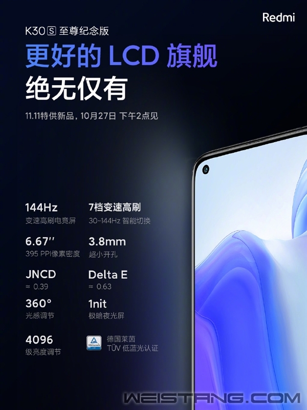 今年最后一款865超大杯来了。今天下午2点,Redmi将召开新品发布会,正式带来K30S至尊纪念版。 从命名也能看出,K30S至尊纪念版是K30至尊纪念版的升级版本。处理器由天玑1000+改为骁龙865,电池容量由4500mAh省级到5000mAh,据悉起内存组合也分别由LPDDR 4X+UFS 2.1升级到LPDDR 5+UFS 3.1。 按照官方说法,K30S至尊纪念版是性能真旗舰,不做“裸奔版”。 此次K30S至尊纪念版另外一个较大的变动是由120Hz AMOLED换成了144Hz LCD屏幕。 在很多人印象中,LCD屏天生不如AMOLED,但官方却表示,K30S至尊纪念版要做就做最好的LCD屏。 “144Hz高刷、7档变速、395PPI高分辨率、专业原色屏、更有全场景护眼体验…毫不谦虚地讲,它将全面颠覆你对LCD屏幕的想象。” 从官方公布的参数来看,K30S至尊纪念版采用的是一块6.67英寸LCD屏,395 PPI像素密度,拥有3.8mm超小开孔,144Hz高刷新率,支持30-144Hz智能切换,7档可调。 此外, 这块LCD屏还支持4096级亮度调节,1nit极暗夜光屏,360°光感调节,支持德国莱茵TUV低蓝光认证。 目前,K30S至尊纪念版最大的悬念就是价格了,考虑到K30至尊纪念版1999元的起售价,新机的售价或为2299元起步,成为当下最超值的骁龙865旗舰机。 |