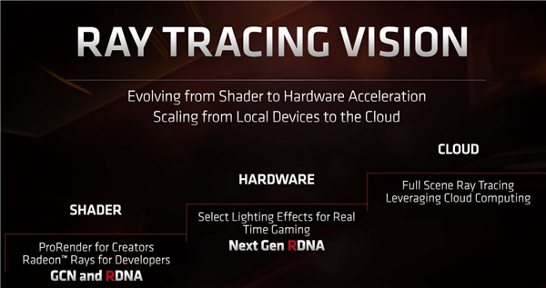 今天凌晨发布的RX 6000系列显卡让A饭过足了瘾,这么多年终于等到AMD在CPU及GPU全面领先的那一天,7999元的RX 6900 XT将11999元的RTX 3090拉下马了。 RX 6000显卡的性能、规格很好很强大,此前的文章中我们已经介绍过了,不过还有一个重要问题不知道大家注意没,那就是AMD并没有详细介绍RDNA2显卡的光线追踪性能,即便它确实支持了DXR光追渲染。 在AMD去年公布的路线图中,介绍了他们对光追技术的设计路线,GCN及第一代RDNA是软加速的,新一代RDNA将支持硬件加速,最终则会迈向云端光追,而且是全场景的,毕竟光追对性能要求极高,只有可能在性能强大的云端实现完整的渲染,本地性能暂时还不够。 在发布会上AMD没有详细介绍RX 6000显卡的光追架构及性能,不过规格表上显示RX 6000显卡也是有专用加速单元的,叫做Ray Accelerators(NVIDIA的叫做RT Core),而且跟CU单元是1:1的,每组CU单元配备1个光追单元,最多80组。 不过RX 6000显卡的光追性能一直没有透露,找了官方PPT也没看到什么实用信息,在这方面AMD要么是留着大招,要么就是现在的硬件光追性能还不够看,索性不比了。 对游戏玩家来说,目前的光追还是可选的,有了很好,没有也不是大问题,关键还是综游戏性能,在这方面AMD已经达到预期了。 |