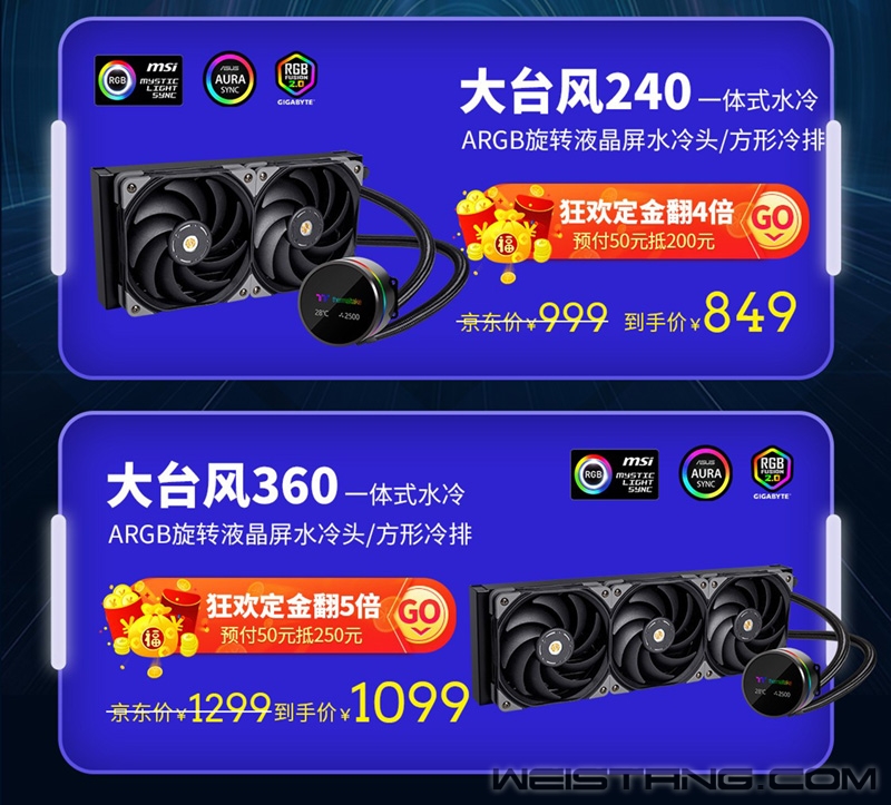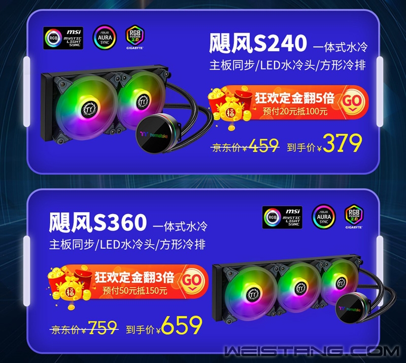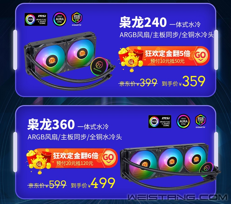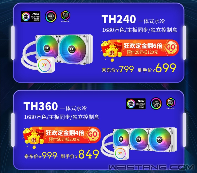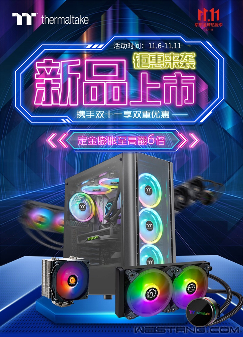 双·11活动已经开始,各种优惠商品让我们眼花缭乱,TT此次也为大家带来了定金最高翻6倍的优惠活动,多款优质商品参与其中,快来看看吧。 11月6日至11月10日预付定金,11月11日付清尾款即可。新品标配三把炫彩风扇,支持E-ATX主板的新品启航者V6机箱预付10元定金可抵50元。新品彩虹D500P散热器,预付10元定金立即抵扣50元现金。 此次活动TT也带来多款新品水冷散热,支持主板同步,LED水冷头的飓风S240一体式水冷,狂欢活动期间定金翻5倍,预付20元可抵100元;而同款飓风S360一体式水冷活动期间定金翻3倍,预付50元抵扣150元现金,到手价仅需659。枭龙240和360一体式水冷活动期间定金也分别翻5倍和6倍,到手价只要359和499,优惠力度如此之大,不容错过。 新品1680万色灯光,支持主板同步的白色TH240一体式水冷定金最高翻6倍!到手价只要699元;同款360水冷定金翻4倍,849元即可到手。而另一款新品大台风一体式水冷,带有ARGB旋转液晶屏水冷头,240版本狂欢活动期间,定金翻4倍,原价999元,预付定金购买到手价只要849;而360版本的大台风一体式水冷活动期间定金翻5倍,预约购买到手价为1099,还在等什么,赶紧来预约购买吧。 更多优惠,尽在Thermaltake京东自营旗舰店。 |